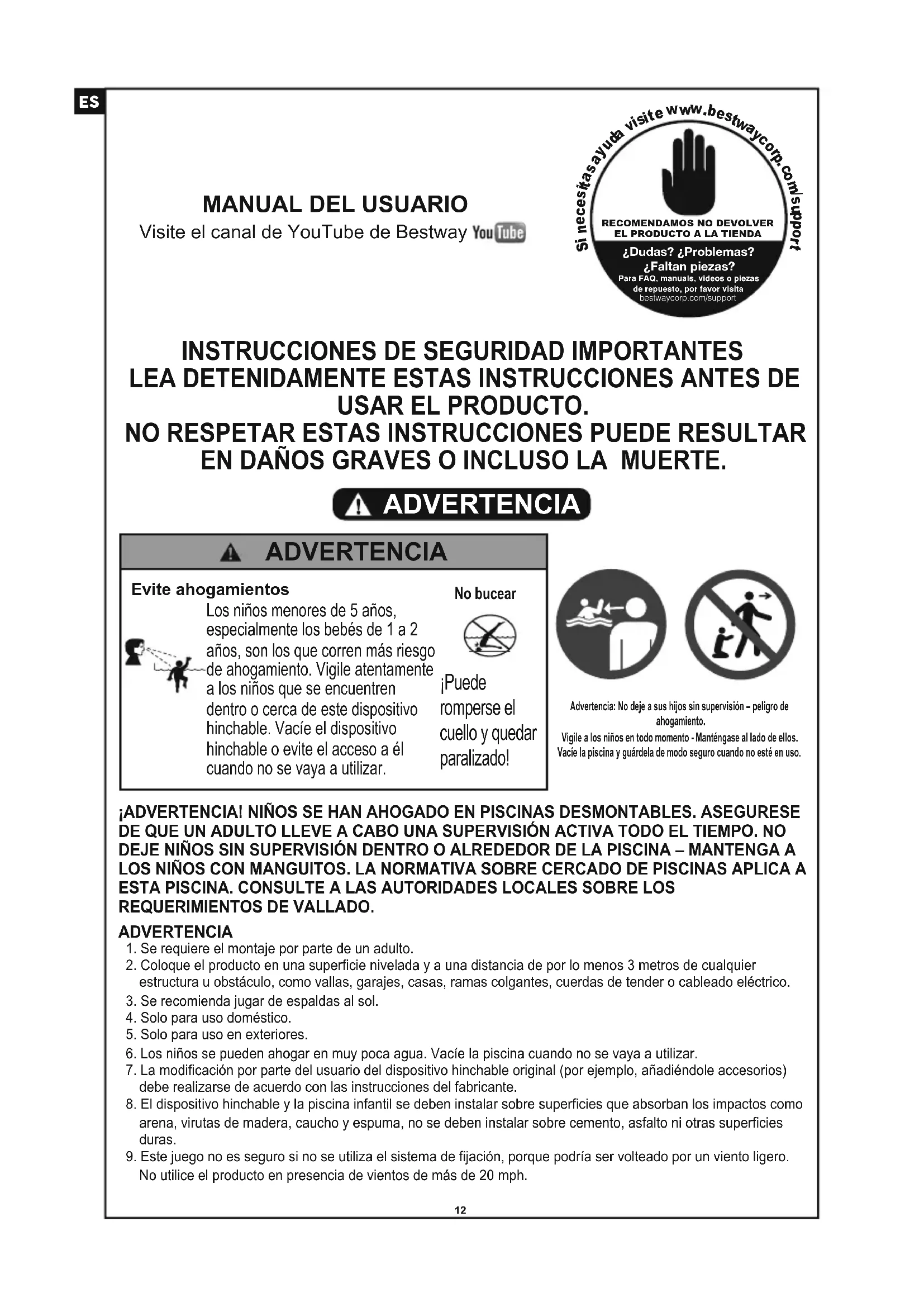 EN DAÑOS GRAVES O INCLUSO LA MUERTE. ADVERTENCIA Advertencia: No deje a sus hijos sin supervisión – peligro de ahogamiento.Vigile a los niños en todo momento - Manténgase al lado de ellos.Vacíe la piscina y guárdela de modo seguro cuando no esté en uso. ¡ADVERTENCIA! NIÑOS SE HAN AHOGADO EN PISCINAS DESMONTABLES. ASEGURESE DE QUE UN ADULTO LLEVE A CABO UNA SUPERVISIÓN ACTIVA TODO EL TIEMPO. NO DEJE NIÑOS SIN SUPERVISIÓN DENTRO O ALREDEDOR DE LA PISCINA – MANTENGA A LOS NIÑOS CON MANGUITOS. LA NORMATIVA SOBRE CERCADO DE PISCINAS APLICA A ESTA PISCINA. CONSULTE A LAS AUTORIDADES LOCALES SOBRE LOS REQUERIMIENTOS DE VALLADO. ADVERTENCIA 1. Se requiere el montaje por parte de un adulto. 2. Coloque el producto en una superficie nivelada y a una distancia de por lo menos 3 metros de cualquier estructura u obstáculo, como vallas, garajes, casas, ramas colgantes, cuerdas de tender o cableado eléctrico. 3. Se recomienda jugar de espaldas al sol. 4. Solo para uso doméstico. 5. Solo para uso en exteriores. 6. Los niños se pueden ahogar en muy poca agua. Vacíe la piscina cuando no se vaya a utilizar. 7. La modificación por parte del usuario del dispositivo hinchable original (por ejemplo, añadiéndole accesorios) debe realizarse de acuerdo con las instrucciones del fabricante. 8. El dispositivo hinchable y la piscina infantil se deben instalar sobre superficies que absorban los impactos como arena, virutas de madera, caucho y espuma, no se deben instalar sobre cemento, asfalto ni otras superficies duras. 9. Este juego no es seguro si no se utiliza el sistema de fijación, porque podría ser volteado por un viento ligero. No utilice el producto en presencia de vientos de más de 20 mph.