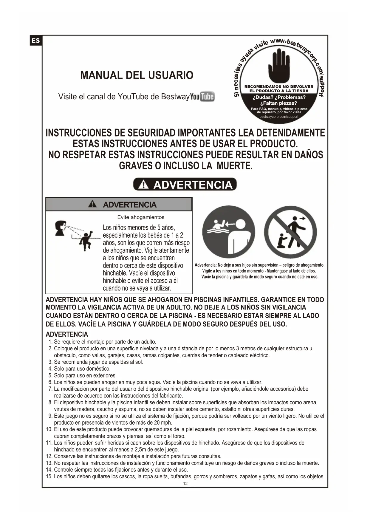 ESTAS INSTRUCCIONES ANTES DE USAR EL PRODUCTO. NO RESPETAR ESTAS INSTRUCCIONES PUEDE RESULTAR EN DAÑOS GRAVES O INCLUSO LA MUERTE. ADVERTENCIA Advertencia: No deje a sus hijos sin supervisión – peligro de ahogamiento.Vigile a los niños en todo momento - Manténgase al lado de ellos.Vacíe la piscina y guárdela de modo seguro cuando no esté en uso.Evite ahogamientosADVERTENCIALos niños menores de 5 años, especialmente los bebés de 1 a 2 años, son los que corren más riesgo de ahogamiento. Vigile atentamente a los niños que se encuentren dentro o cerca de este dispositivo hinchable. Vacíe el dispositivo hinchable o evite el acceso a él cuando no se vaya a utilizar.ADVERTENCIA HAY NIÑOS QUE SE AHOGARON EN PISCINAS INFANTILES. GARANTICE EN TODO MOMENTO LA VIGILANCIA ACTIVA DE UN ADULTO. NO DEJE A LOS NIÑOS SIN VIGILANCIA CUANDO ESTÁN DENTRO O CERCA DE LA PISCINA - ES NECESARIO ESTAR SIEMPRE AL LADO DE ELLOS. VACÍE LA PISCINA Y GUÁRDELA DE MODO SEGURO DESPUÉS DEL USO.ADVERTENCIA 1. Se requiere el montaje por parte de un adulto.