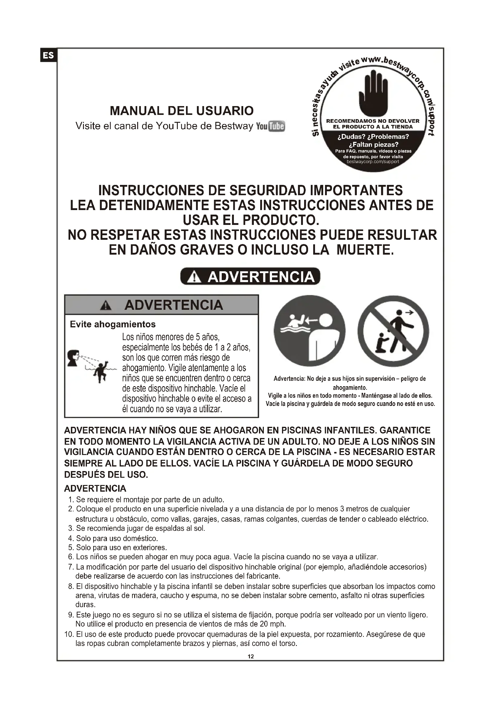 EN DAÑOS GRAVES O INCLUSO LA MUERTE. ADVERTENCIA Evite ahogamientos Los niños menores de 5 años, especialmente los bebés de 1 a 2 años, son los que corren más riesgo de ahogamiento. Vigile atentamente a los niños que se encuentren dentro o cerca de este dispositivo hinchable. Vacíe el dispositivo hinchable o evite el acceso a él cuando no se vaya a utilizar. ADVERTENCIA Advertencia: No deje a sus hijos sin supervisión – peligro de ahogamiento.Vigile a los niños en todo momento - Manténgase al lado de ellos.Vacíe la piscina y guárdela de modo seguro cuando no esté en uso.ADVERTENCIA HAY NIÑOS QUE SE AHOGARON EN PISCINAS INFANTILES. GARANTICE EN TODO MOMENTO LA VIGILANCIA ACTIVA DE UN ADULTO. NO DEJE A LOS NIÑOS SIN VIGILANCIA CUANDO ESTÁN DENTRO O CERCA DE LA PISCINA - ES NECESARIO ESTAR SIEMPRE AL LADO DE ELLOS. VACÍE LA PISCINA Y GUÁRDELA DE MODO SEGURO DESPUÉS DEL USO.ADVERTENCIA 1. Se requiere el montaje por parte de un adulto. 2. Coloque el producto en una superficie nivelada y a una distancia de por lo menos 3 metros de cualquier estructura u obstáculo, como vallas, garajes, casas, ramas colgantes, cuerdas de tender o cableado eléctrico. 3. Se recomienda jugar de espaldas al sol. 4. Solo para uso doméstico. 5. Solo para uso en exteriores. 6. Los niños se pueden ahogar en muy poca agua. Vacíe la piscina cuando no se vaya a utilizar. 7. La modificación por parte del usuario del dispositivo hinchable original (por ejemplo, añadiéndole accesorios) debe realizarse de acuerdo con las instrucciones del fabricante. 8. El dispositivo hinchable y la piscina infantil se deben instalar sobre superficies que absorban los impactos como arena, virutas de madera, caucho y espuma, no se deben instalar sobre cemento, asfalto ni otras superficies duras. 9. Este juego no es seguro si no se utiliza el sistema de fijación, porque podría ser volteado por un viento ligero. No utilice el producto en presencia de vientos de más de 20 mph.10. El uso de este producto puede provocar quemaduras de la piel expuesta, por rozamiento. Asegúrese de que las ropas cubran completamente brazos y piernas, así como el torso.