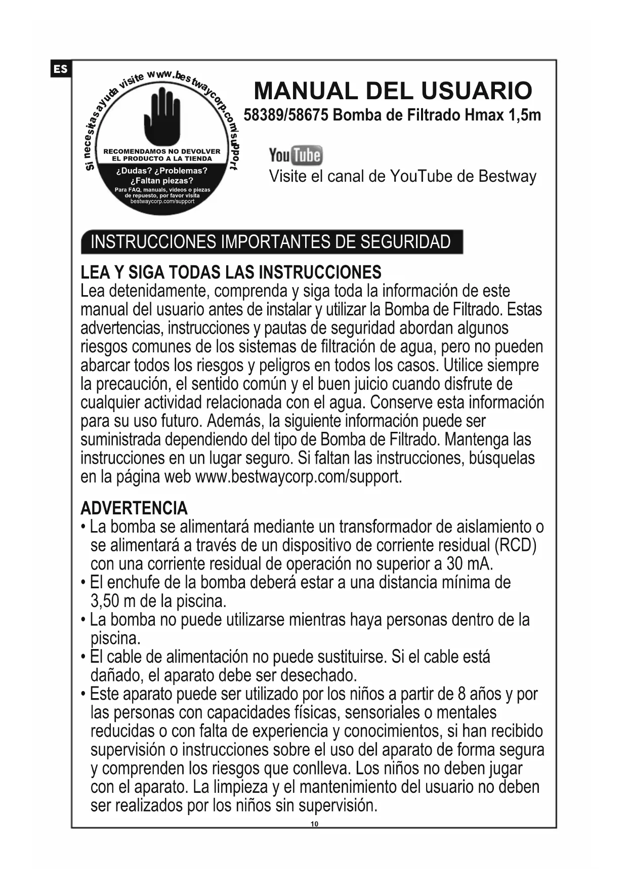Lea detenidamente, comprenda y siga toda la información de este manual del usuario antes de instalar y utilizar la Bomba de Filtrado. Estas advertencias, instrucciones y pautas de seguridad abordan algunos riesgos comunes de los sistemas de filtración de agua, pero no pueden abarcar todos los riesgos y peligros en todos los casos. Utilice siempre la precaución, el sentido común y el buen juicio cuando disfrute de cualquier actividad relacionada con el agua. Conserve esta información para su uso futuro. Además, la siguiente información puede ser suministrada dependiendo del tipo de Bomba de Filtrado. Mantenga las instrucciones en un lugar seguro. Si faltan las instrucciones, búsquelas en la página web www.bestwaycorp.com/support. ADVERTENCIA