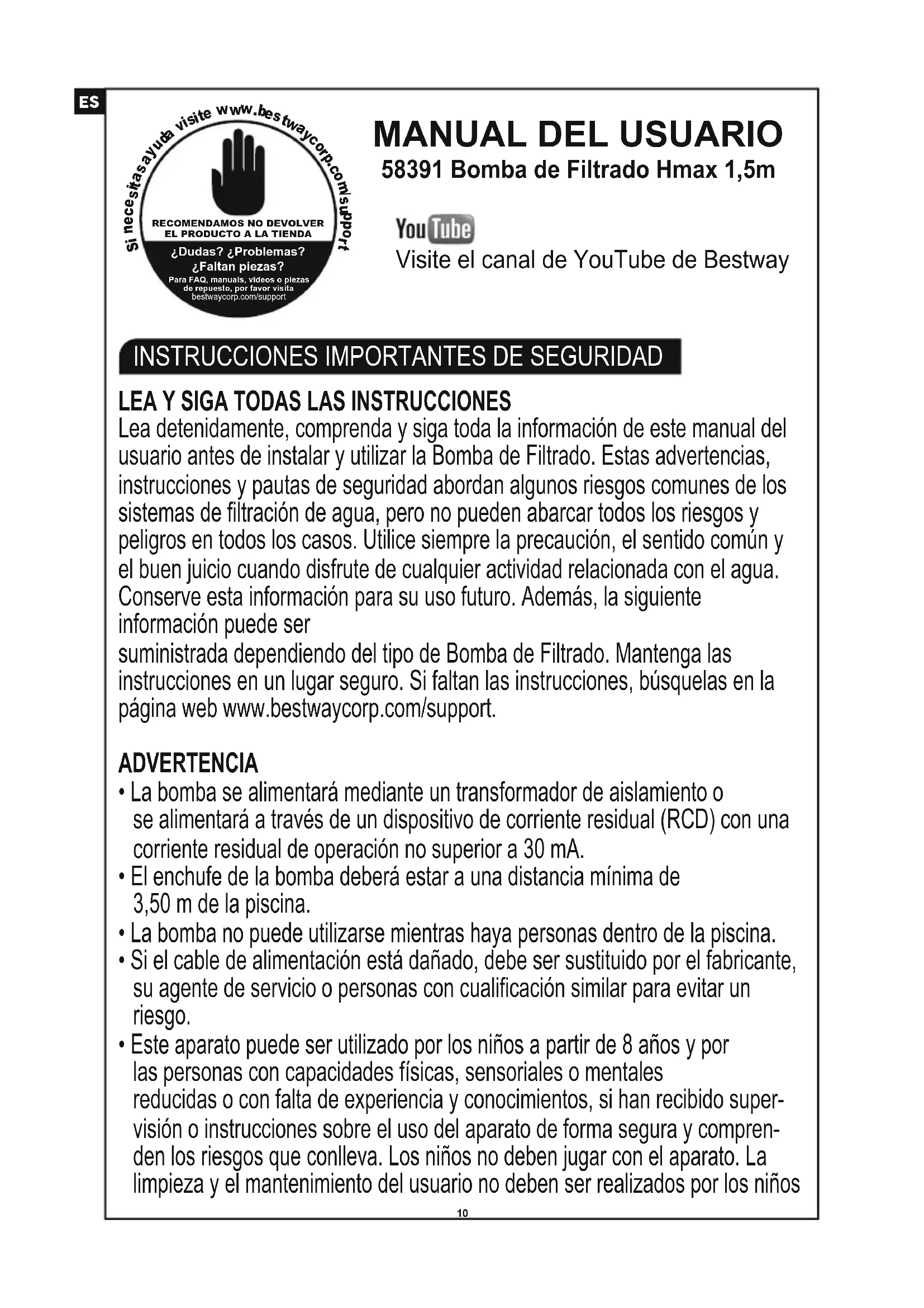 Lea detenidamente, comprenda y siga toda la información de este manual del usuario antes de instalar y utilizar la Bomba de Filtrado. Estas advertencias, instrucciones y pautas de seguridad abordan algunos riesgos comunes de los sistemas de filtración de agua, pero no pueden abarcar todos los riesgos y peligros en todos los casos. Utilice siempre la precaución, el sentido común y el buen juicio cuando disfrute de cualquier actividad relacionada con el agua. Conserve esta información para su uso futuro. Además, la siguiente información puede ser suministrada dependiendo del tipo de Bomba de Filtrado. Mantenga las instrucciones en un lugar seguro. Si faltan las instrucciones, búsquelas en la página web www.bestwaycorp.com/support. ADVERTENCIA