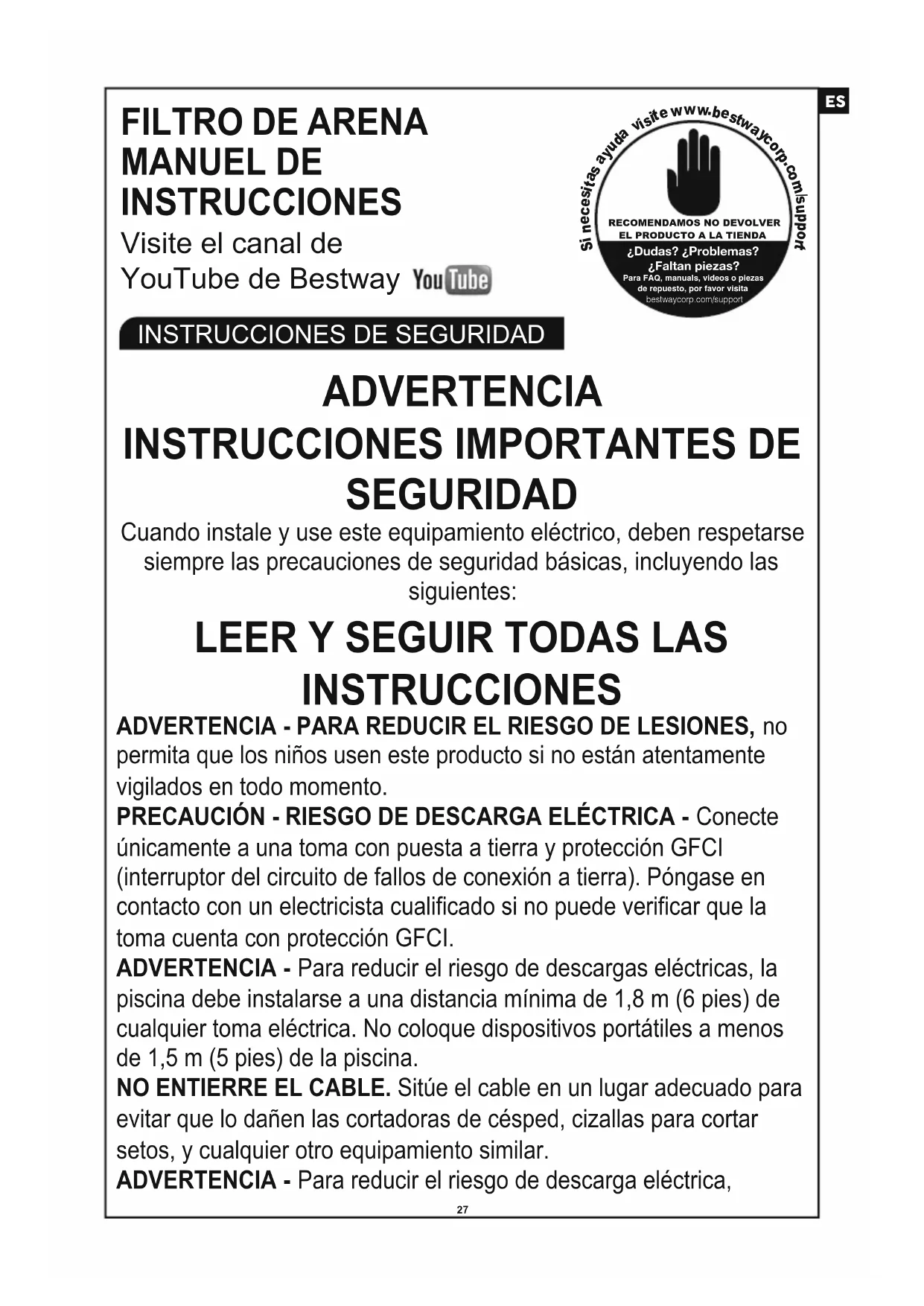INSTRUCCIONES ADVERTENCIA - PARA REDUCIR EL RIESGO DE LESIONES, no permita que los niños usen este producto si no están atentamente vigilados en todo momento. PRECAUCIÓN - RIESGO DE DESCARGA ELÉCTRICA - Conecte únicamente a una toma con puesta a tierra y protección GFCI (interruptor del circuito de fallos de conexión a tierra). Póngase en contacto con un electricista cualificado si no puede verificar que la toma cuenta con protección GFCI. ADVERTENCIA - Para reducir el riesgo de descargas eléctricas, la piscina debe instalarse a una distancia mínima de 1,8 m (6 pies) de cualquier toma eléctrica. No coloque dispositivos portátiles a menos de 1,5 m (5 pies) de la piscina. NO ENTIERRE EL CABLE. Sitúe el cable en un lugar adecuado para evitar que lo dañen las cortadoras de césped, cizallas para cortar setos, y cualquier otro equipamiento similar. ADVERTENCIA - Para reducir el riesgo de descarga eléctrica, sustituya el cable dañado inmediatamente. Si el cable de suministro está dañado, debe ser sustituido por el fabricante, su agente de servicio o una persona con una cualificación similar para evitar cualquier accidente. ADVERTENCIA - Para reducir el riesgo de descarga eléctrica, no use una extensión para conectar la unidad al suministro eléctrico; sitúe una toma en un lugar adecuado. PRECAUCIÓN: Este bomba puede usarse sólo con piscinas que se guardan. No lo use con piscinas instaladas de manera permanente. Una piscina que se puede guardar se fabrica de manera que se puede desmontar rápidamente para guardarla y volver a montarla de nuevo. Una piscina instalada de manera permanente dentro del suelo o sobre el mismo o en una construcción no puede ser desmontada para guardarla. ADVERTENCIA- Este aparato no está pensado para ser utilizado por personas (incluidos niños) con capacidades físicas, sensoriales o mentales reducidas o con falta de experiencia y conocimiento, a no ser que sea bajo supervisión o después de recibir instrucciones precisas respecto al uso del aparato de una persona responsible de su seguridad. En presencia de niños, mantenga el aparato bajo control para evitar que jueguen con él. Las instalaciones eléctricas deben cumplir la normativa nacional en materia de cableado, consulte con un electricista cualificado para cualquier duda. La bomba debe estar equipada con un transformador aislante o recibir alimentación eléctrica a través de un dispositivo diferencial residual (RCD) con una intensidad de corriente de régimen nominal no superior a 30 mA. Por favor, examine y compruebe todos los componentes del filtro de arena antes del uso. Notifique al servicio al cliente de Bestway en la dirección indicada en este manual cualquier pieza que falte o esté dañada en el momento de la compra.
