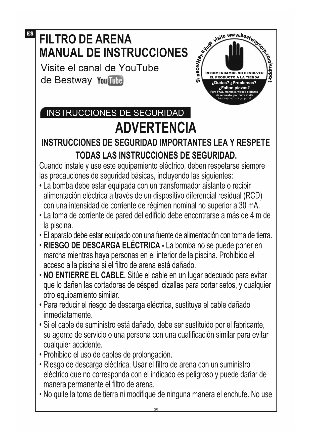 Visite el canal de YouTube de Bestway RECOMENDAMOS NO DEVOLVEREL PRODUCTO A LA TIENDA¿Dudas? ¿Problemas?¿Faltan piezas?Para FAQ, manuals, videos o piezasde repuesto, por favor visita bestwaycorp.com/support
