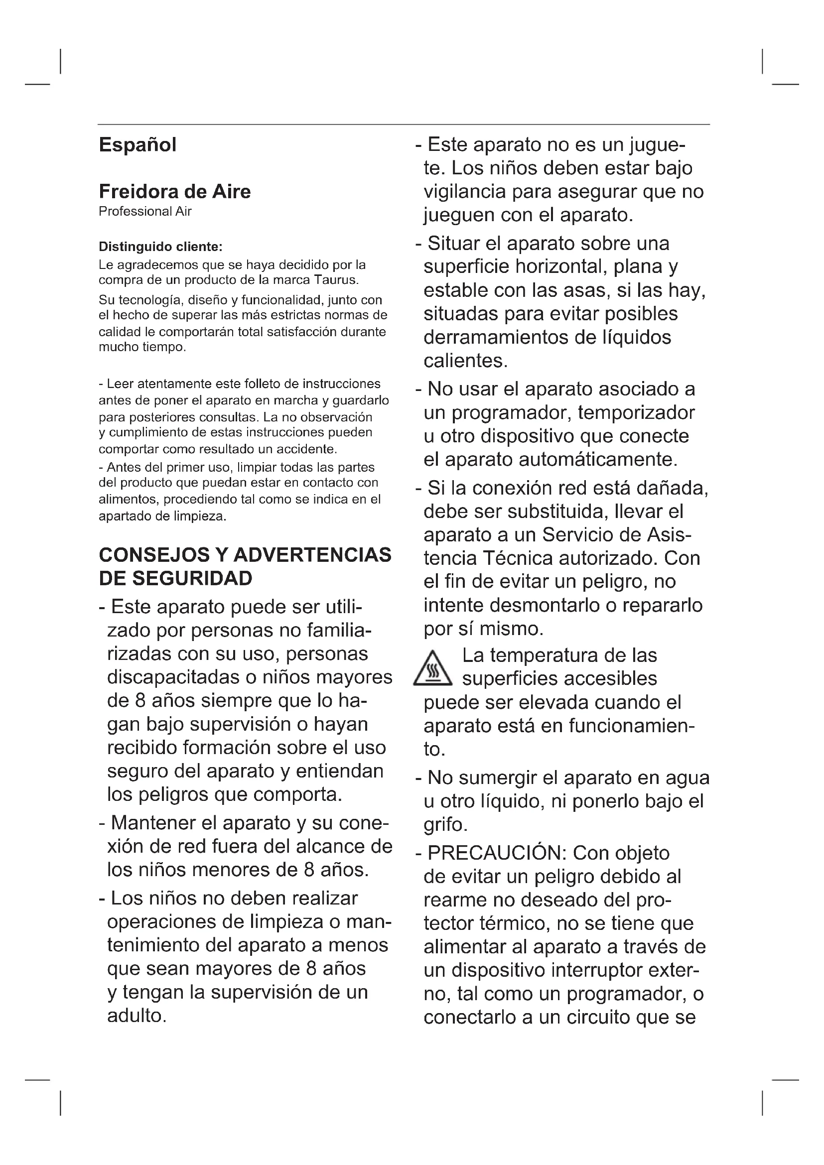 Professional Air - Freidora TAURUS - Manual de uso y guía de instrucciones gratis