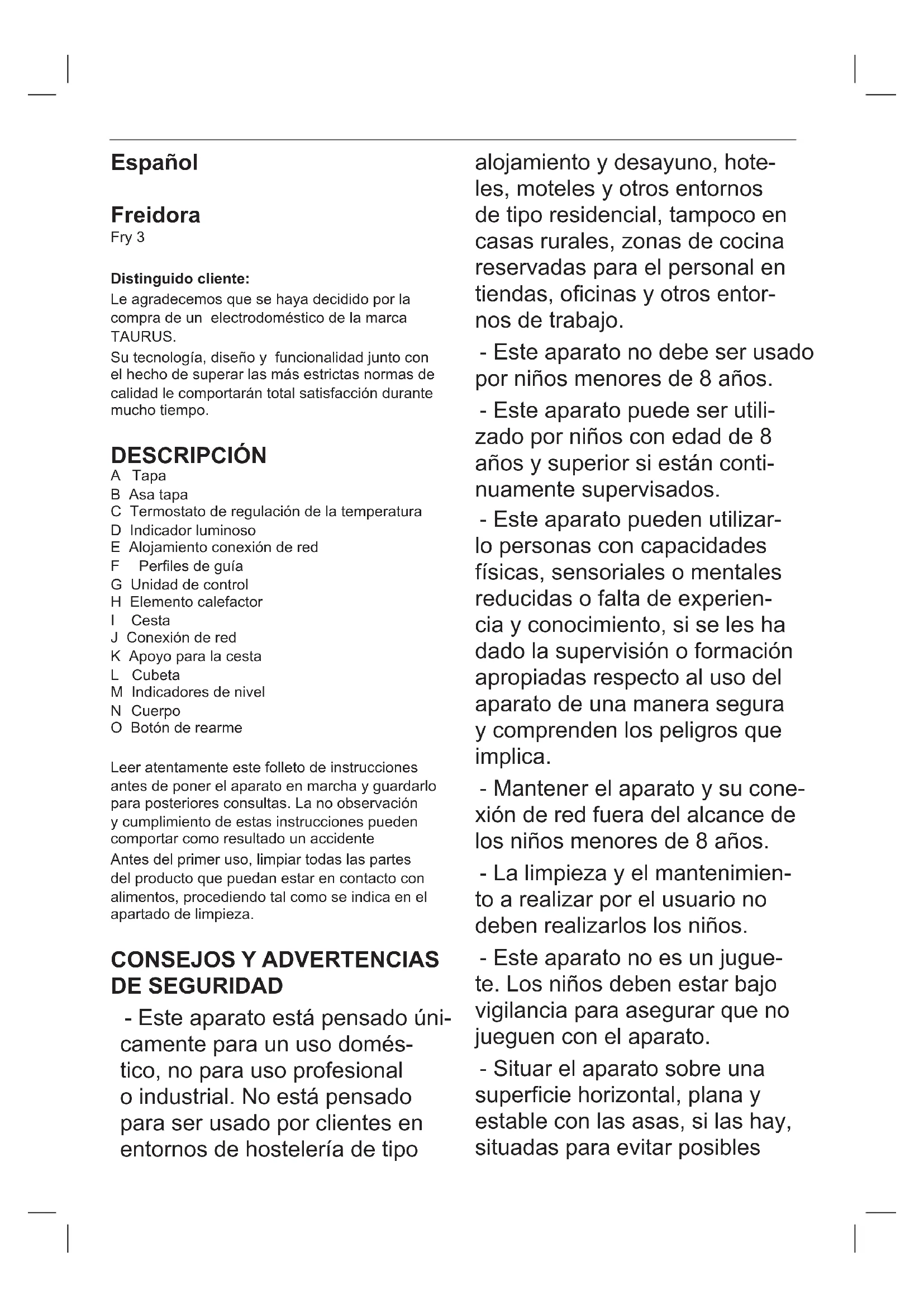 EFig.1Español Freidora Fry 3 Distinguido cliente: Le agradecemos que se haya decidido por la compra de un electrodoméstico de la marca TAURUS. Su tecnología, diseño y funcionalidad junto con el hecho de superar las más estrictas normas de calidad le comportarán total satisfacción durante mucho tiempo. DESCRIPCIÓN A Tapa B Asa tapa C Termostato de regulación de la temperatura D Indicador luminoso E Alojamiento conexión de red F Perlesdeguía G Unidad de control H Elemento calefactor I Cesta J Conexión de red K Apoyo para la cesta L Cubeta M Indicadores de nivel N Cuerpo O Botón de rearme Leer atentamente este folleto de instrucciones antes de poner el aparato en marcha y guardarlo para posteriores consultas. La no observación y cumplimiento de estas instrucciones pueden comportar como resultado un accidente Antes del primer uso, limpiar todas las partes del producto que puedan estar en contacto con alimentos, procediendo tal como se indica en el apartado de limpieza.