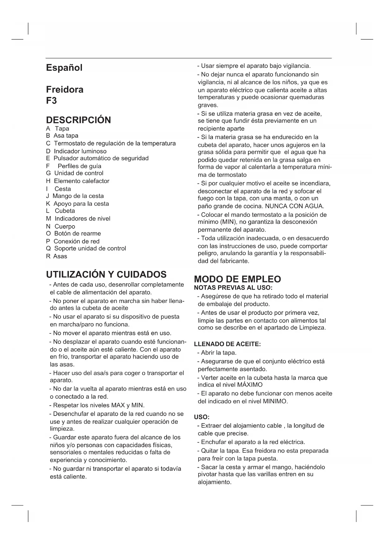 - Antes de cada uso, desenrollar completamente el cable de alimentación del aparato. - No poner el aparato en marcha sin haber llena- do antes la cubeta de aceite - No usar el aparato si su dispositivo de puesta en marcha/paro no funciona. - No mover el aparato mientras está en uso. - No desplazar el aparato cuando esté funcionan- do o el aceite aún esté caliente. Con el aparato enfrío,transportarelaparatohaciendousode las asas. - Hacer uso del asa/s para coger o transportar el aparato. - No dar la vuelta al aparato mientras está en uso o conectado a la red. - Respetar los niveles MAX y MIN. - Desenchufar el aparato de la red cuando no se use y antes de realizar cualquier operación de limpieza. - Guardar este aparato fuera del alcance de los niñosy/opersonasconcapacidadesfísicas, sensoriales o mentales reducidas o falta de experiencia y conocimiento. - Noguardarnitransportarelaparatositodavía está caliente. - Usar siempre el aparato bajo vigilancia. - No dejar nunca el aparato funcionando sin vigilancia, ni al alcance de los niños, ya que es un aparato eléctrico que calienta aceite a altas temperaturas y puede ocasionar quemaduras graves. - Si se utiliza materia grasa en vez de aceite, se tiene que fundir ésta previamente en un recipiente aparte - Si la materia grasa se ha endurecido en la cubeta del aparato, hacer unos agujeros en la grasa sólida para permitir que el agua que ha podido quedar retenida en la grasa salga en formadevaporalcalentarlaatemperaturamíni- ma de termostato - Si por cualquier motivo el aceite se incendiara, desconectar el aparato de la red y sofocar el fuego con la tapa, con una manta, o con un paño grande de cocina. NUNCA CON AGUA. - Colocar el mando termostato a la posición de mínimo(MIN),nogarantizaladesconexión permanente del aparato. - Toda utilización inadecuada, o en desacuerdo con las instrucciones de uso, puede comportar peligro,anulandolagarantíaylaresponsabili- dad del fabricante.