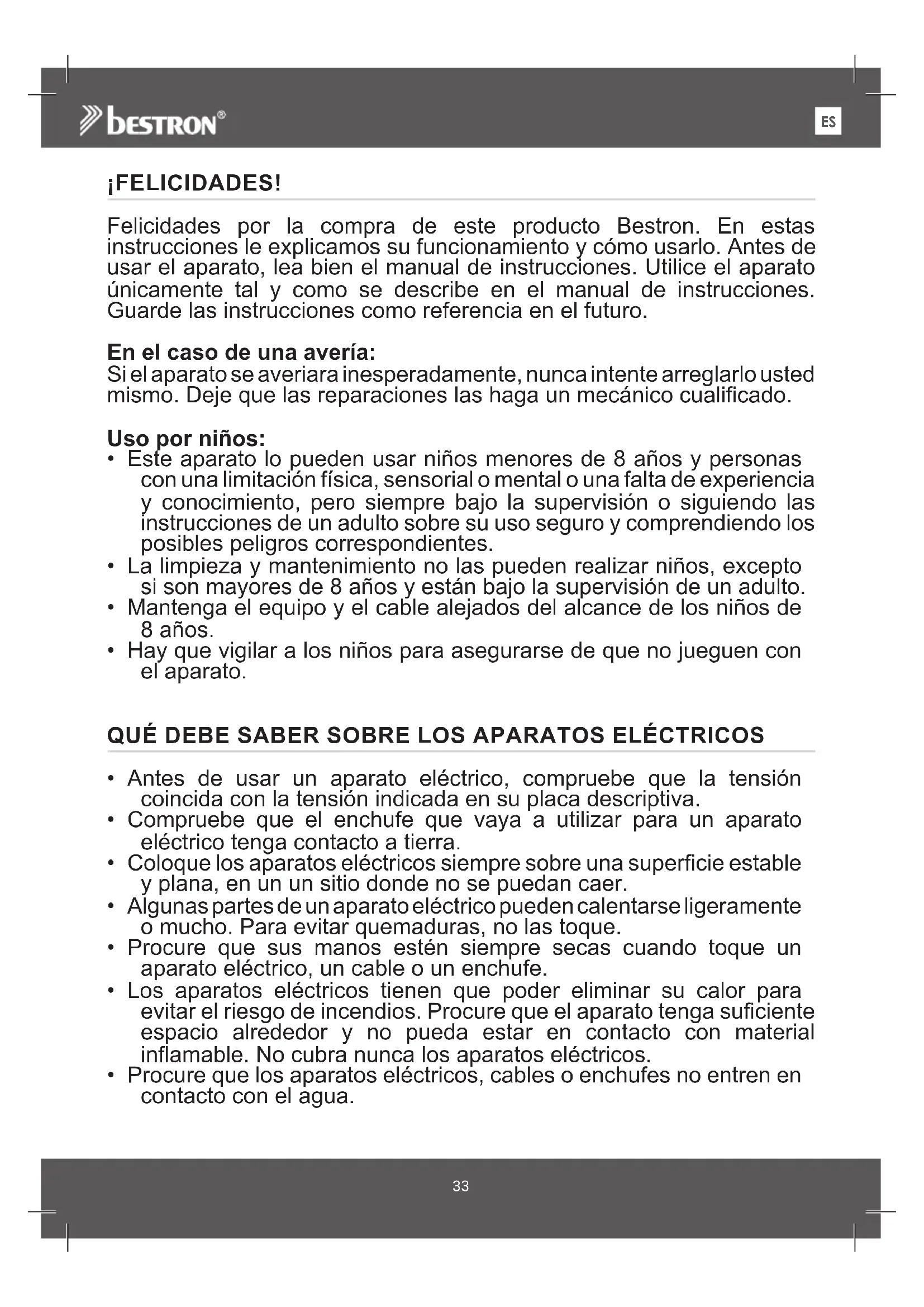 ¡FELICIDADES! Felicidades por la compra de este producto Bestron. En estas instrucciones le explicamos su funcionamiento y cómo usarlo. Antes de usar el aparato, lea bien el manual de instrucciones. Utilice el aparato únicamente tal y como se describe en el manual de instrucciones. Guarde las instrucciones como referencia en el futuro. En el caso de una avería: Si el aparato se averiara inesperadamente, nunca intente arreglarlo usted mismo. Deje que las reparaciones las haga un mecánico cualificado. Uso por niños: