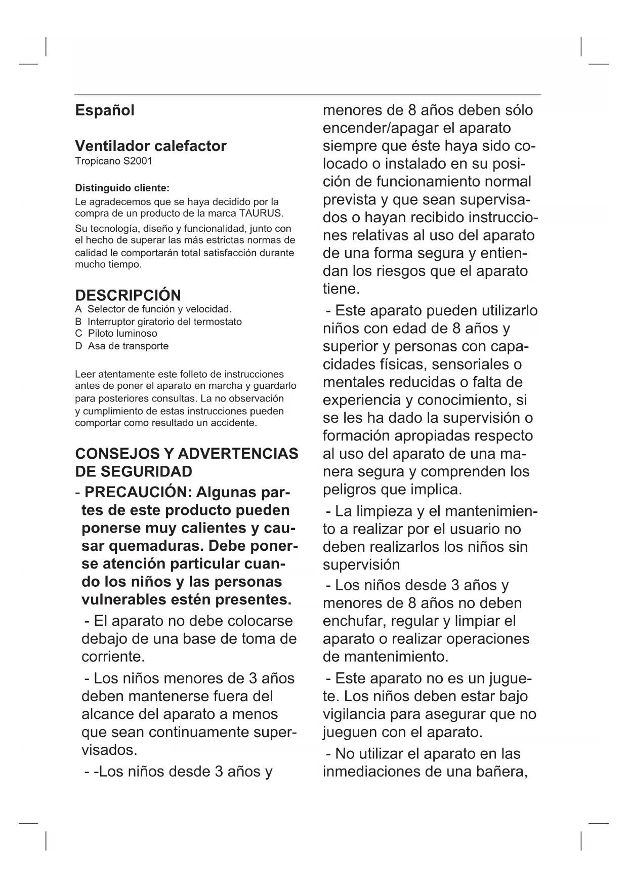 Fig.1Español Ventilador calefactor Tropicano S2001 Distinguido cliente: Le agradecemos que se haya decidido por la compra de un producto de la marca TAURUS. Su tecnología, diseño y funcionalidad, junto con el hecho de superar las más estrictas normas de calidad le comportarán total satisfacción durante mucho tiempo. DESCRIPCIÓN A Selector de función y velocidad. B Interruptor giratorio del termostato C Piloto luminoso D Asa de transporte Leer atentamente este folleto de instrucciones antes de poner el aparato en marcha y guardarlo para posteriores consultas. La no observación y cumplimiento de estas instrucciones pueden comportar como resultado un accidente.