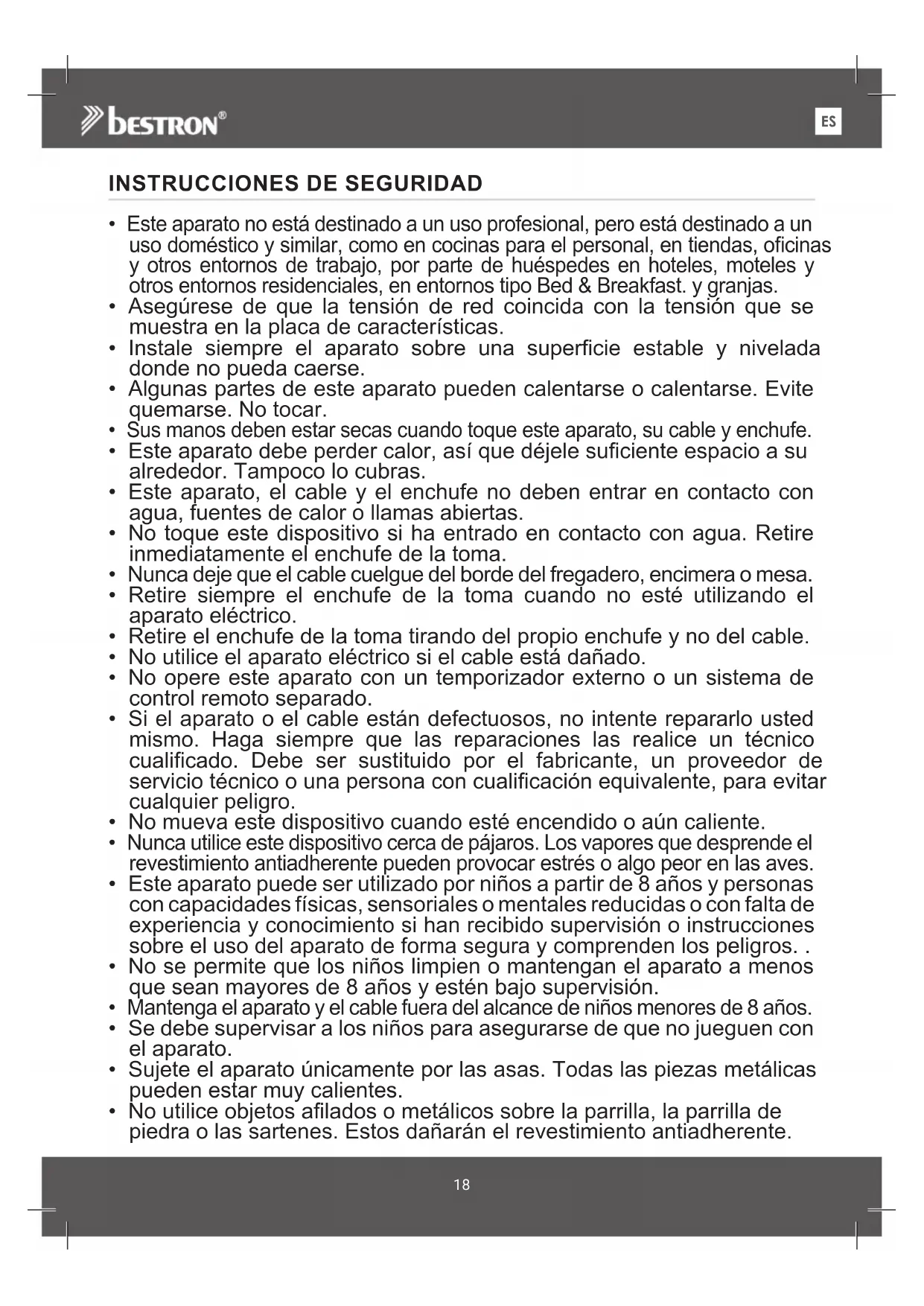 - Su municipio puede indicarle dónde encontrar el punto de recogida de residuos designado en su barrio. SERVICIO En el improbable caso de que se produzca un mal funcionamiento, póngase en contacto con el servicio de atención al cliente de Bestron: www.bestron.com/service Especificaciones técnicas Modelo ARG1200CO Red eléctrica (V) 220-240V Frecuencia (Hz) 50/60 Clase de seguridad 1 Energía (Watt) 1200-1400 Ruido (dB(A)) - Max. Capacidad - Tiempo máximo de funcionamiento continuo (KB) - Dimensiones (largo x ancho x alto) (cm) 47,5x22,5x14 Longitud del cable (cm) 10020