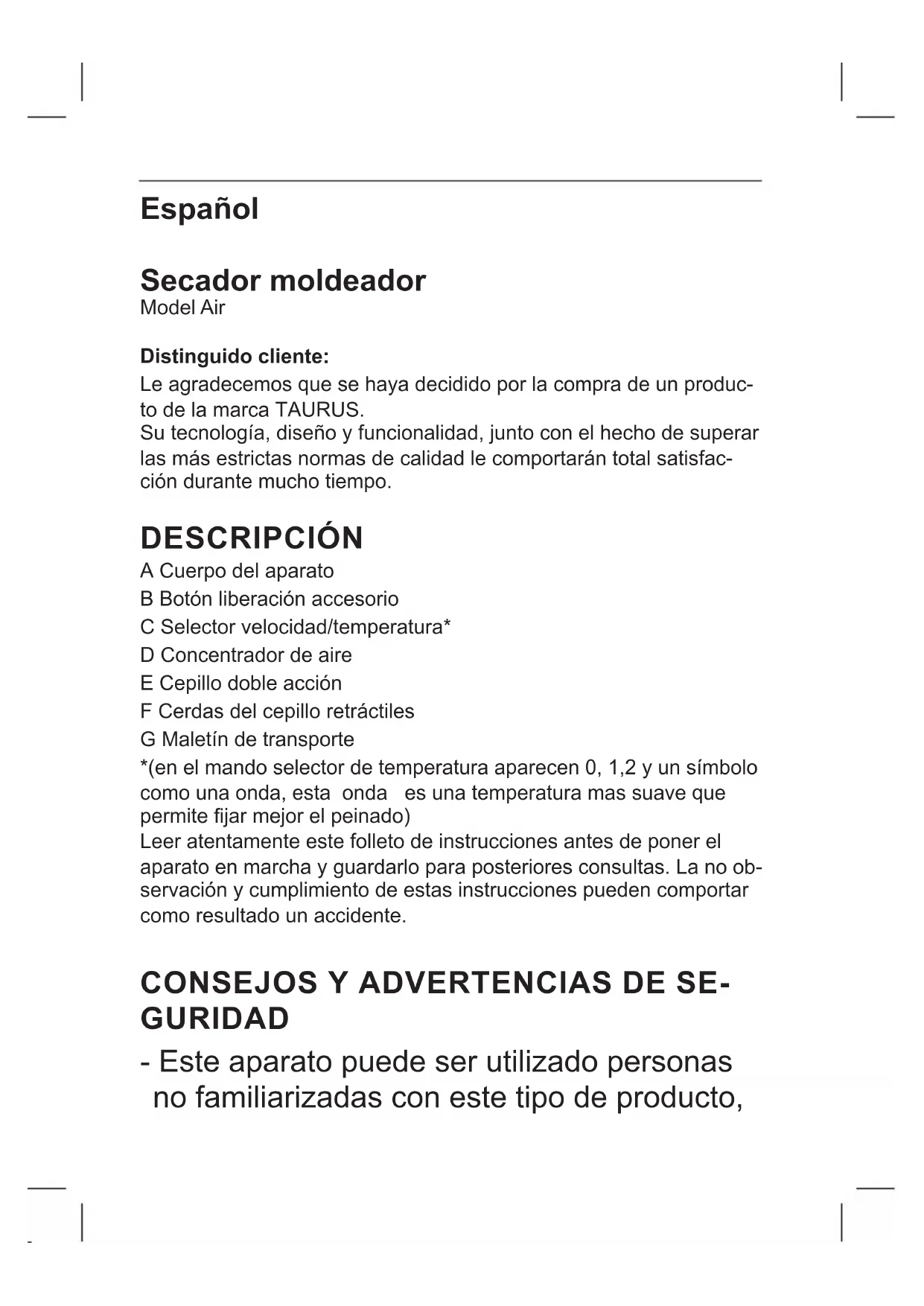 GFig.1 Fig.2Español Secador moldeador Model Air Distinguido cliente: Le agradecemos que se haya decidido por la compra de un produc- to de la marca TAURUS. Su tecnología, diseño y funcionalidad, junto con el hecho de superar las más estrictas normas de calidad le comportarán total satisfac- ción durante mucho tiempo. DESCRIPCIÓN A Cuerpo del aparato B Botón liberación accesorio C Selector velocidad/temperatura* D Concentrador de aire E Cepillo doble acción F Cerdas del cepillo retráctiles G Maletín de transporte *(en el mando selector de temperatura aparecen 0, 1,2 y un símbolo como una onda, esta onda es una temperatura mas suave que permite jar mejor el peinado) Leer atentamente este folleto de instrucciones antes de poner el aparato en marcha y guardarlo para posteriores consultas. La no ob- servación y cumplimiento de estas instrucciones pueden comportar como resultado un accidente.