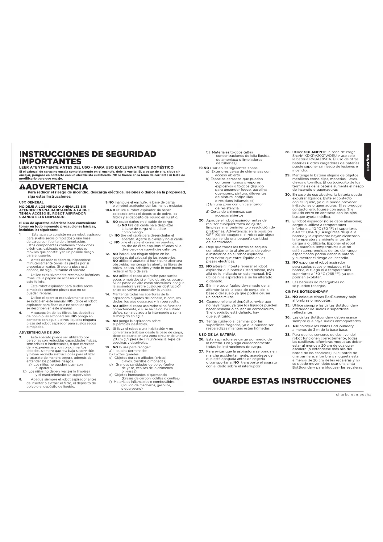- Conserve su recibo de compra. Si necesita hacer uso de la garantía, necesitaremos el recibo para comprobar que la información que nos ha suministrado es correcta. En caso de no disponer del documento de compra, la garantía ya no es válida. ¿Cuánto duran las garantías de las máquinas nuevas Shark? La confianza en nuestro diseño y en nuestro control de calidad nos permite garantizar su nueva aspiradora Shark durante de dos años. ¿Qué cubre la garantía gratuita Shark? La reparación o sustitución de su aparato Shark (queda a discreción de Shark si se debe sustituir o reparar), incluidas todas las piezas y la mano de obra. La garantía Shark es adicional a sus derechos legales como consumidor. ¿Qué aspectos no cubre la garantía gratuita Shark? 1 Obstrucciones: para obtener información sobre cómo desatascar la aspiradora, consulte las instrucciones. 2 Desgaste normal de las piezas que requieren un mantenimiento o una sustitución regulares para asegurar el funcionamiento adecuado de la unidad. 3 Daño accidental y fallos debidos a uso o mantenimiento incorrecto, descuido, maniobras imprudentes o manipulación de la aspiradora que no respete lo indicado en las instrucciones de Shark suministradas con el aparato. 4 Uso de la aspiradora para fines distintos de la limpieza normal del hogar. 5 Montaje de componentes o accesorios en contradicción con las instrucciones. 6 Uso de piezas o accesorios que no sean originales de Shark. 7 Instalación incorrecta (salvo que la haya efectuado Shark). ¿Dónde puedo adquirir recambios y accesorios originales Shark? Los recambios y accesorios Shark están diseñados por los mismos ingenieros que desarrollan las aspiradoras Shark. Puede ver el catálogo de recambios, piezas de repuesto y accesorios originales para todos los aparatos de Shark en www. sharkclean.eu. Recuerde que el uso de recambios nooriginales de Shark podría anular la garantía del fabricante. No obstante, sus derechos legales no se verán afectados. www.sharkclean.es/EULA ACUERDO DE LICENCIA DE USUARIO FINAL DEL SOFTWARE DE SHARKNINJAsharkclean.eusharkclean.eu AVERTISSEMENT Pour réduire les risques d’incendie, de chocs électriques, de blessures ou de dommages matériels: