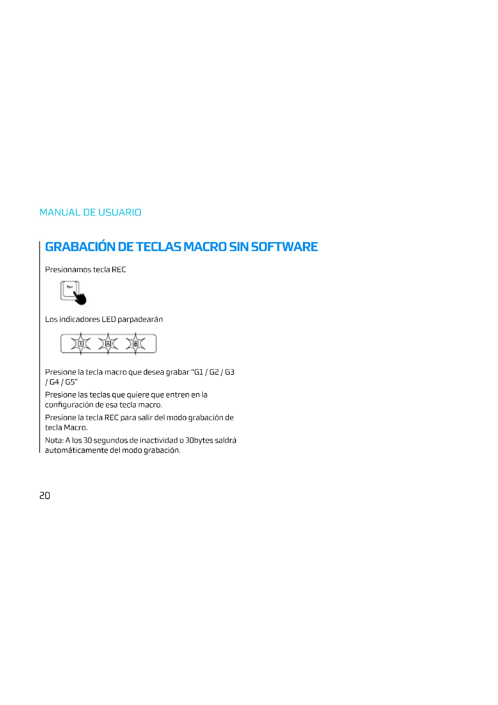 GRABACIÓN DE TECLAS MACRO SIN SOFTWARE Presionamos tecla REC Los indicadores LED parpadearán Presione la tecla macro que desea grabar “G1 / G2 / G3 / G4 / G5” Presione las teclas que quiere que entren en la configuración de esa tecla macro. Presione la tecla REC para salir del modo grabación de tecla Macro. Nota: A los 30 segundos de inactividad o 30bytes saldrá automáticamente del modo grabación.ESPAÑOL