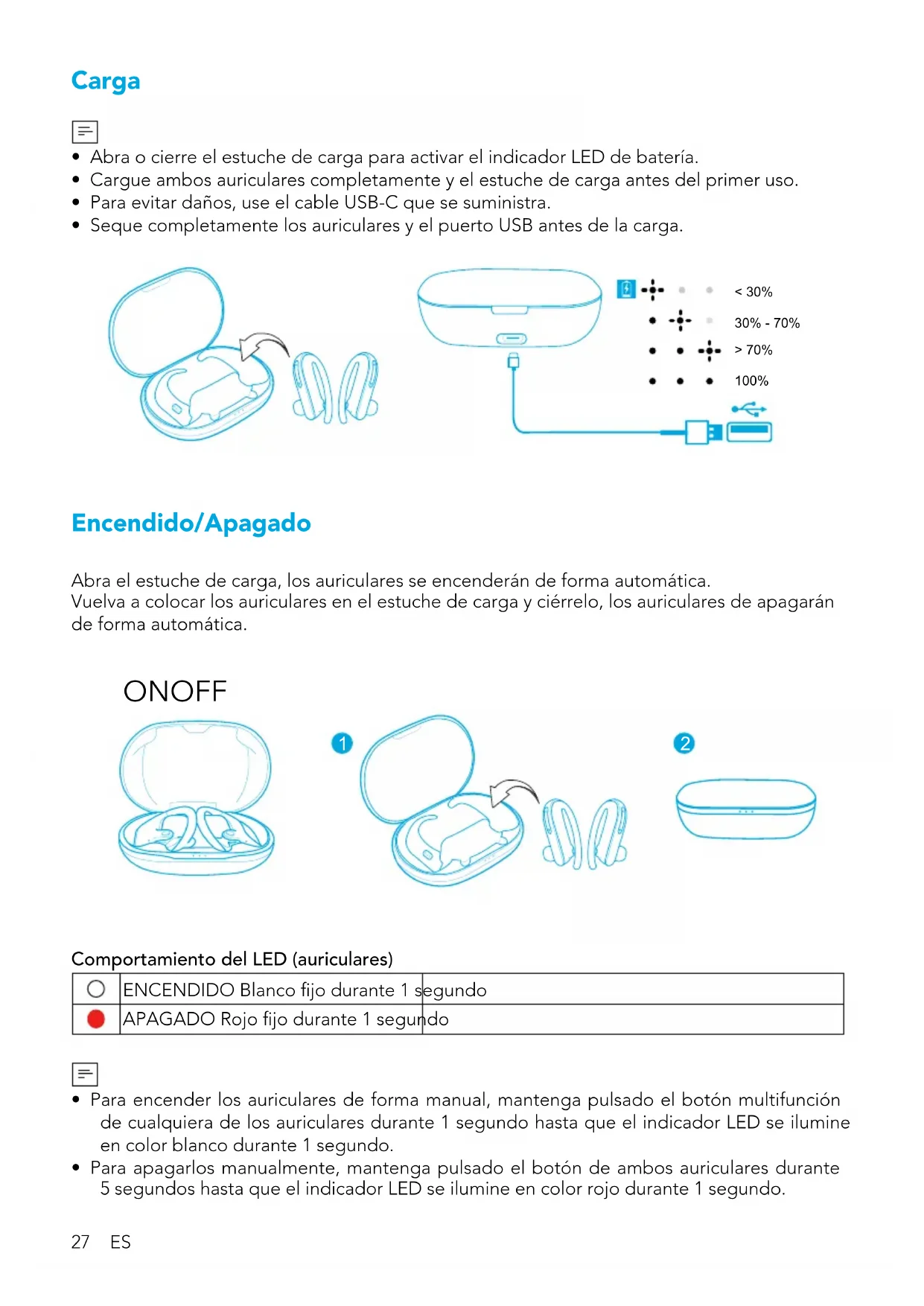 - Seque completamente los auriculares y el puerto USB antes de la carga. < 30% 30% - 70% > 70% 100% Encendido/Apagado Abra el estuche de carga, los auriculares se encenderán de forma automática. Vuelva a colocar los auriculares en el estuche de carga y ciérrelo, los auriculares de apagarán de forma automática. ON OFF