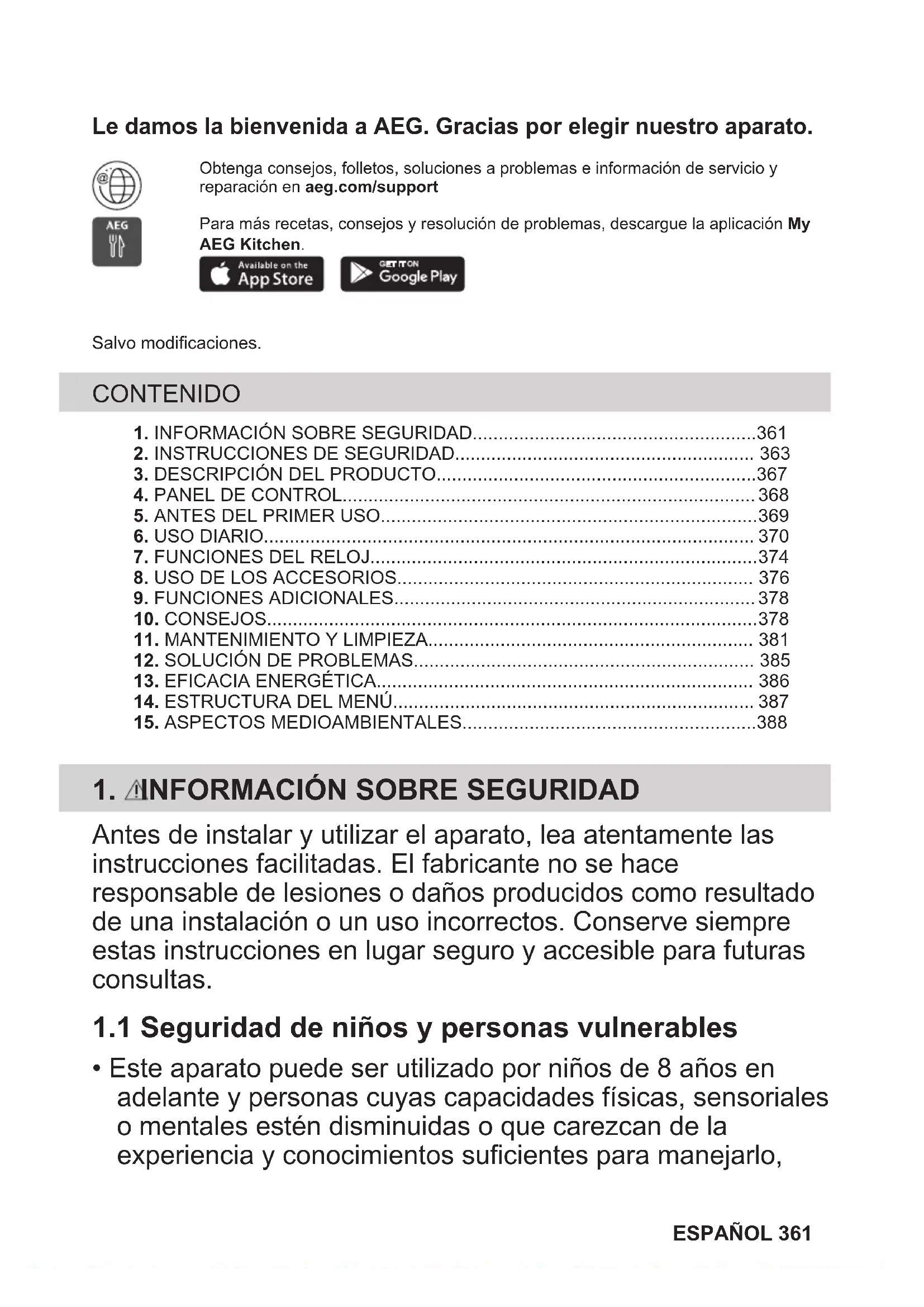 - Este aparato puede ser utilizado por niños de 8 años en adelante y personas cuyas capacidades físicas, sensoriales o mentales estén disminuidas o que carezcan de la experiencia y conocimientos suficientes para manejarlo, ESPAÑOL 361siempre que cuenten con las instrucciones o la supervisión sobre el uso del electrodoméstico de forma segura y comprendan los riesgos. Es necesario mantener alejados del aparato a los niños de menos de 8 años, así como a las personas con minusvalías importantes y complejas, salvo que estén bajo supervisión continua.