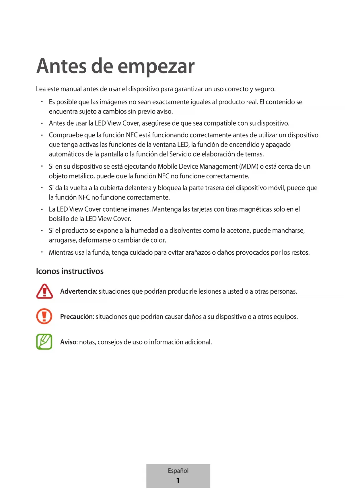 Mientras usa la funda, tenga cuidado para evitar arañazos o daños provocados por los restos. Iconos instructivos Advertencia: situaciones que podrían producirle lesiones a usted o a otras personas. Precaución: situaciones que podrían causar daños a su dispositivo o a otros equipos. Aviso: notas, consejos de uso o información adicional. Español