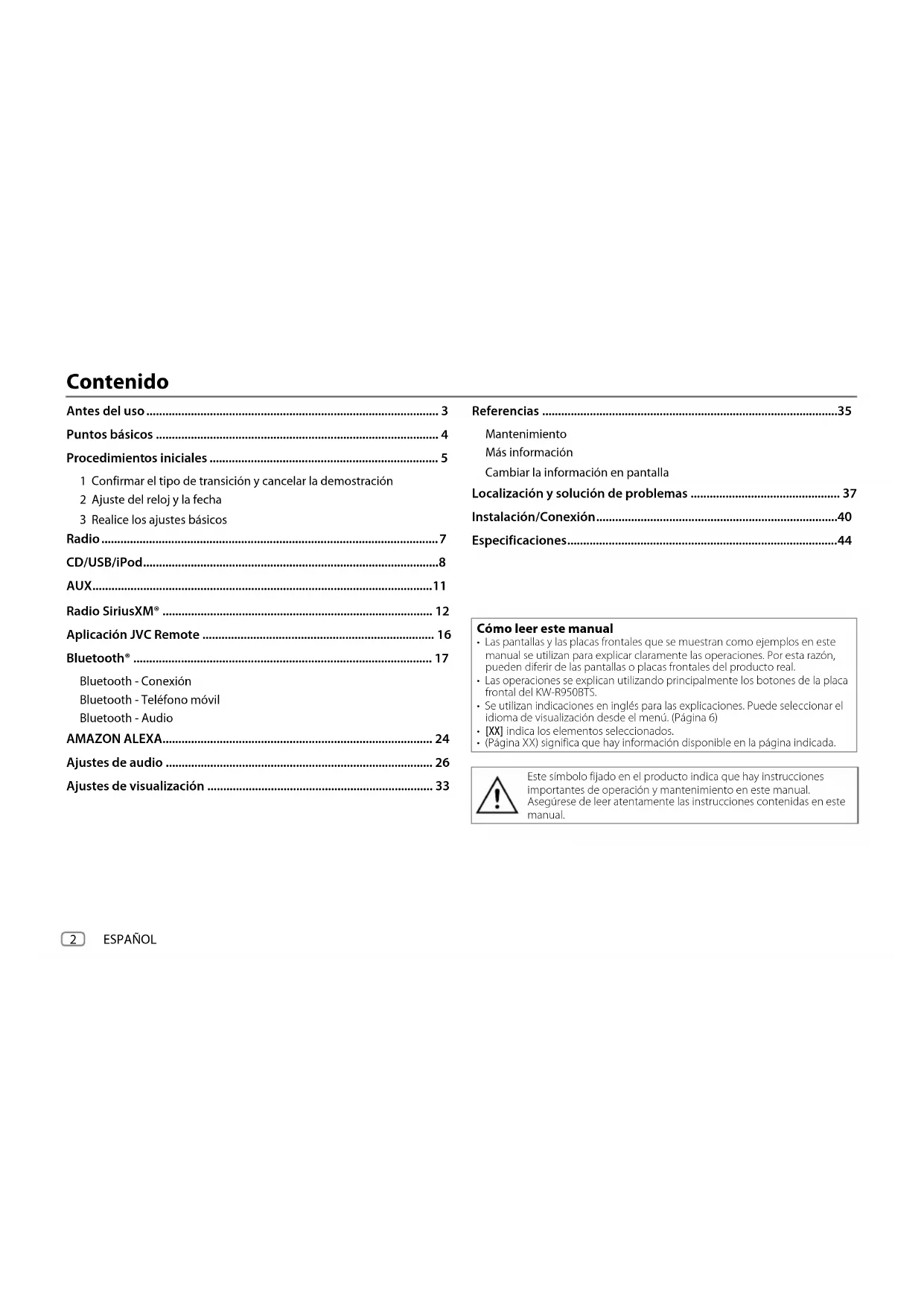 - (PáginaXX) significa que hay información disponible en la página indicada. Este símbolo fijado en el producto indica que hay instrucciones importantes de operación y mantenimiento en este manual. Asegúrese de leer atentamente las instrucciones contenidas en este manual. KW_R950BTS_K_SP.indd 2KW_R950BTS_K_SP.indd 2 28/3/2022 9:54:00 AM28/3/2022 9:54:00 AMESPAÑOL