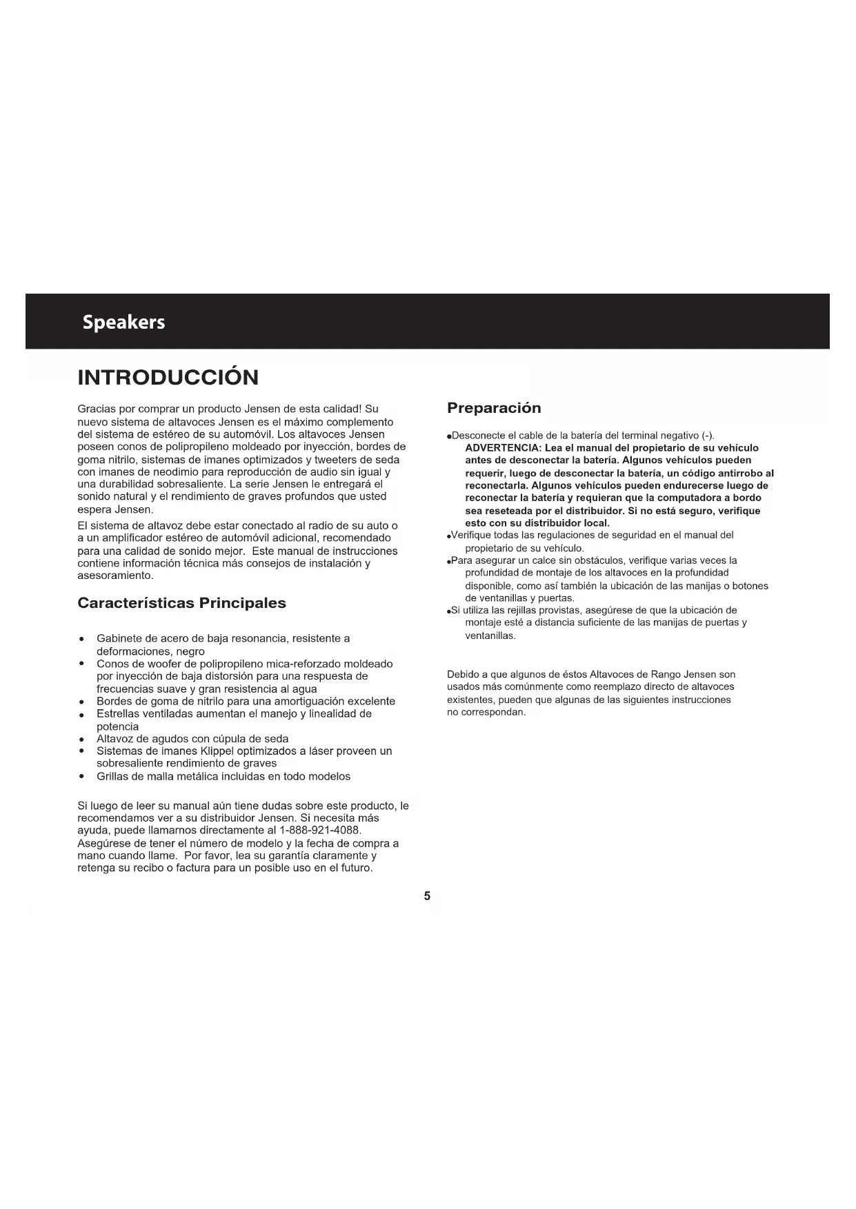 Gabinete de acero de baja resonancia, resistente a deformaciones, negro Conos de woofer de polipropileno mica-reforzado moldeado por inyección de baja distorsión para una respuesta de frecuencias suave y gran resistencia al agua Bordes de goma de nitrilo para una amortiguación excelente Estrellas ventiladas aumentan el manejo y linealidad de potencia Altavoz de agudos con cúpula de seda Sistemas de imanes Klippel optimizados a láser proveen un sobresaliente rendimiento de graves Grillas de malla metálica incluidas en todo modelos INTRODUCCIÓN Gracias por comprar un producto Jensen de esta calidad! Su nuevo sistema de altavoces Jensen es el máximo complemento del sistema de estéreo de su automóvil. Los altavoces Jensen poseen conos de polipropileno moldeado por inyección, bordes de goma nitrilo, sistemas de imanes optimizados y tweeters de seda con imanes de neodimio para reproducción de audio sin igual y una durabilidad sobresaliente. La serie Jensen le entregará el sonido natural y el rendimiento de graves profundos que usted espera Jensen. El sistema de altavoz debe estar conectado al radio de su auto o a un amplificador estéreo de automóvil adicional, recomendado para una calidad de sonido mejor. Este manual de instrucciones contiene información técnica más consejos de instalación y asesoramiento. Características Principales