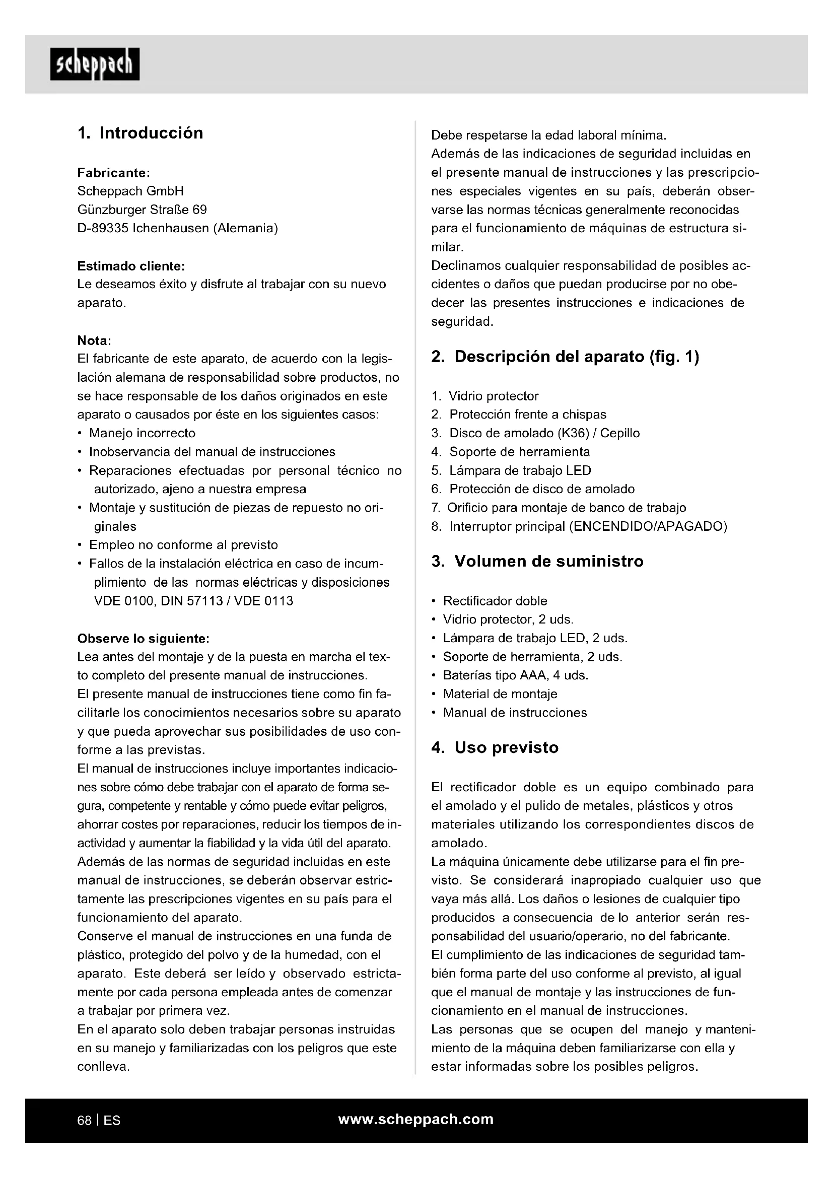 Fabricante: Scheppach GmbH Günzburger Straße 69 D-89335 Ichenhausen (Alemania) Estimado cliente: Le deseamos éxito y disfrute al trabajar con su nuevo aparato. Nota: El fabricante de este aparato, de acuerdo con la legis- lación alemana de responsabilidad sobre productos, no se hace responsable de los daños originados en este aparato o causados por éste en los siguientes casos: