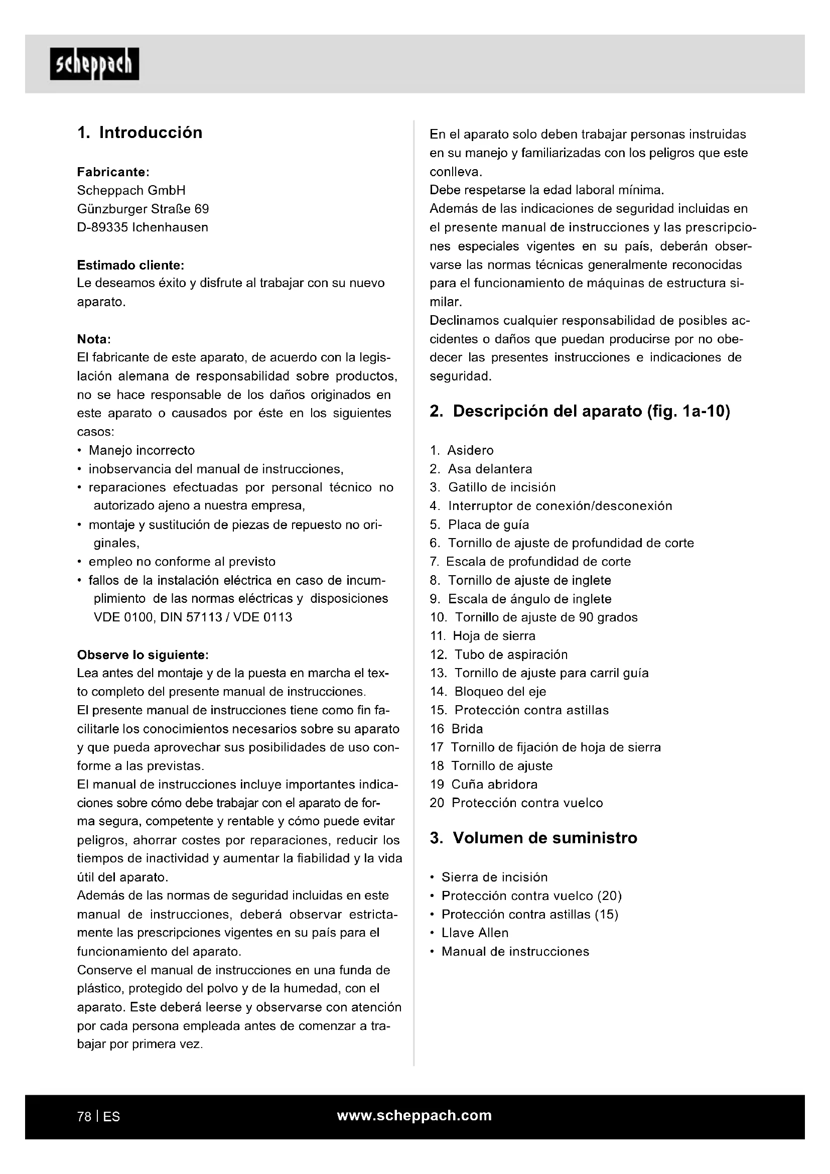 Observe lo siguiente: Lea antes del montaje y de la puesta en marcha el tex- to completo del presente manual de instrucciones. El presente manual de instrucciones tiene como n fa- cilitarle los conocimientos necesarios sobre su aparato y que pueda aprovechar sus posibilidades de uso con- forme a las previstas. El manual de instrucciones incluye importantes indica- ciones sobre cómo debe trabajar con el aparato de for- ma segura, competente y rentable y cómo puede evitar peligros, ahorrar costes por reparaciones, reducir los tiempos de inactividad y aumentar la abilidad y la vida útil del aparato. Además de las normas de seguridad incluidas en este manual de instrucciones, deberá observar estricta- mente las prescripciones vigentes en su país para el funcionamiento del aparato. Conserve el manual de instrucciones en una funda de plástico, protegido del polvo y de la humedad, con el aparato. Este deberá leerse y observarse con atención por cada persona empleada antes de comenzar a tra- bajar por primera vez.www.scheppach.com
