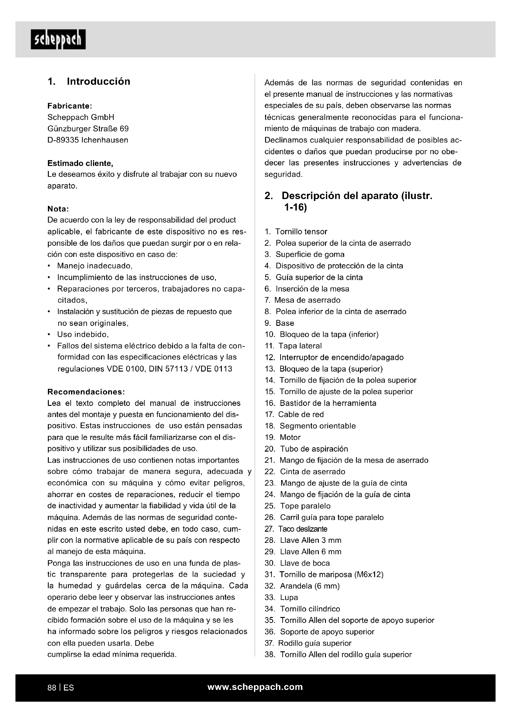 Fabricante: Scheppach GmbH Günzburger Straße 69 D-89335 Ichenhausen Estimado cliente, Le deseamos éxito y disfrute al trabajar con su nuevo aparato. Nota: De acuerdo con la ley de responsabilidad del product aplicable, el fabricante de este dispositivo no es res- ponsible de los daños que puedan surgir por o en rela- ción con este dispositivo en caso de: