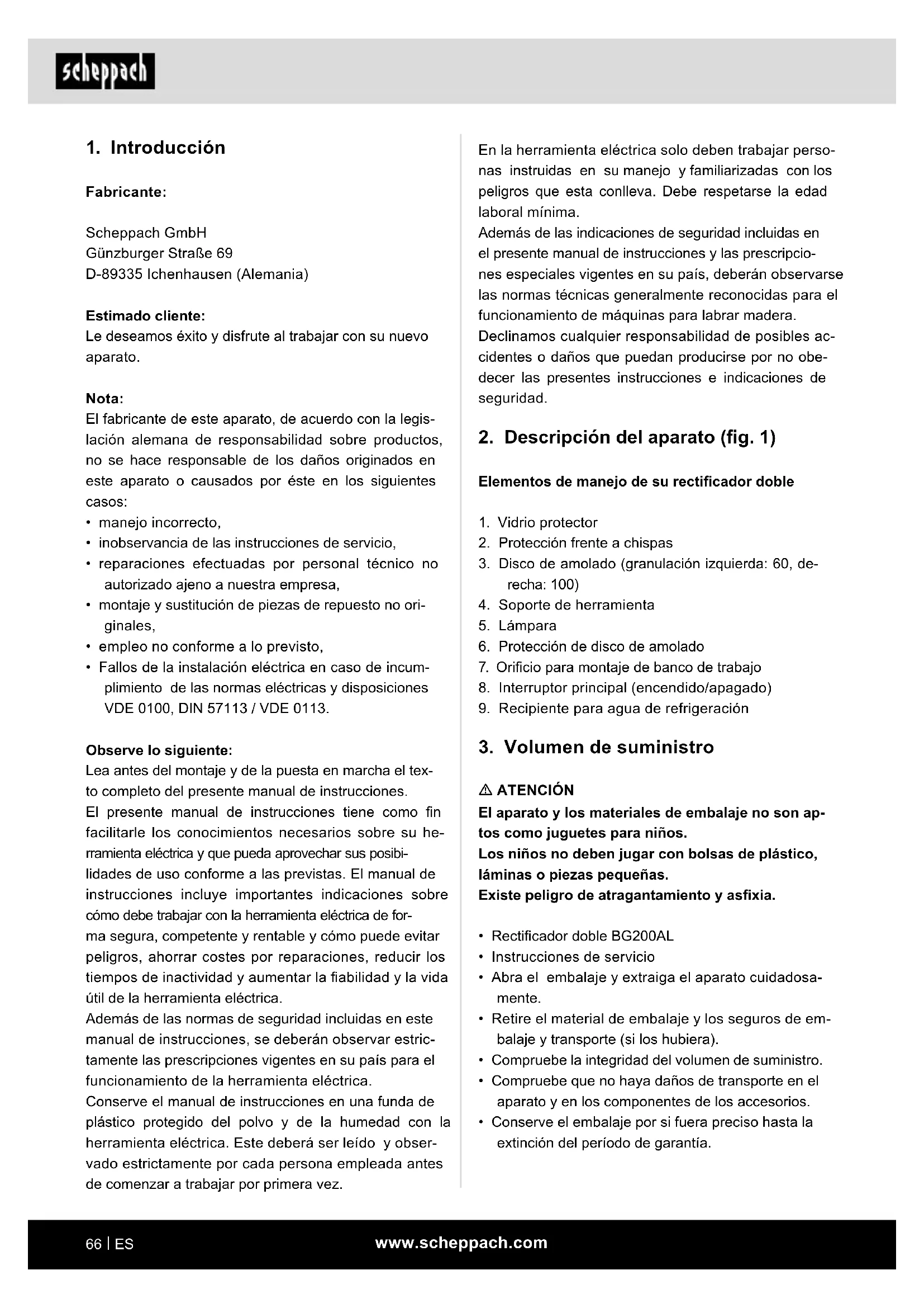 Fabricante: Scheppach GmbH Günzburger Straße 69 D-89335 Ichenhausen (Alemania) Estimado cliente: Le deseamos éxito y disfrute al trabajar con su nuevo aparato. Nota: El fabricante de este aparato, de acuerdo con la legis- lación alemana de responsabilidad sobre productos, no se hace responsable de los daños originados en este aparato o causados por éste en los siguientes casos: