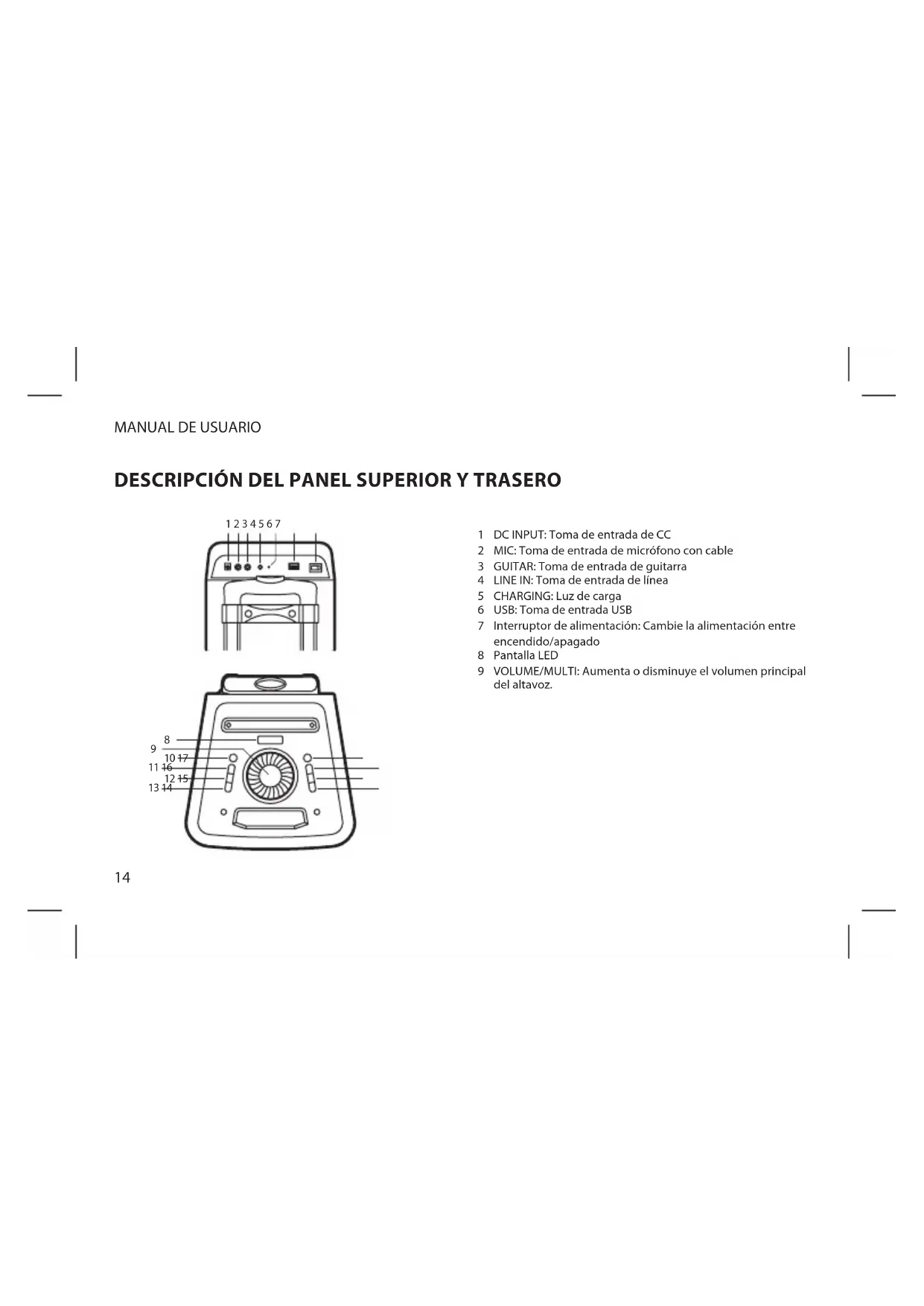 DESCRIPCIÓN DEL PANEL SUPERIOR Y TRASERO DC INPUT: Toma de entrada de CC MIC: Toma de entrada de micrófono con cable GUITAR: Toma de entrada de guitarra LINE IN: Toma de entrada de línea CHARGING: Luz de carga USB: Toma de entrada USB Interruptor de alimentación: Cambie la alimentación entre encendido/apagado Pantalla LED VOLUME/MULTI: Aumenta o disminuye el volumen principal del altavoz.