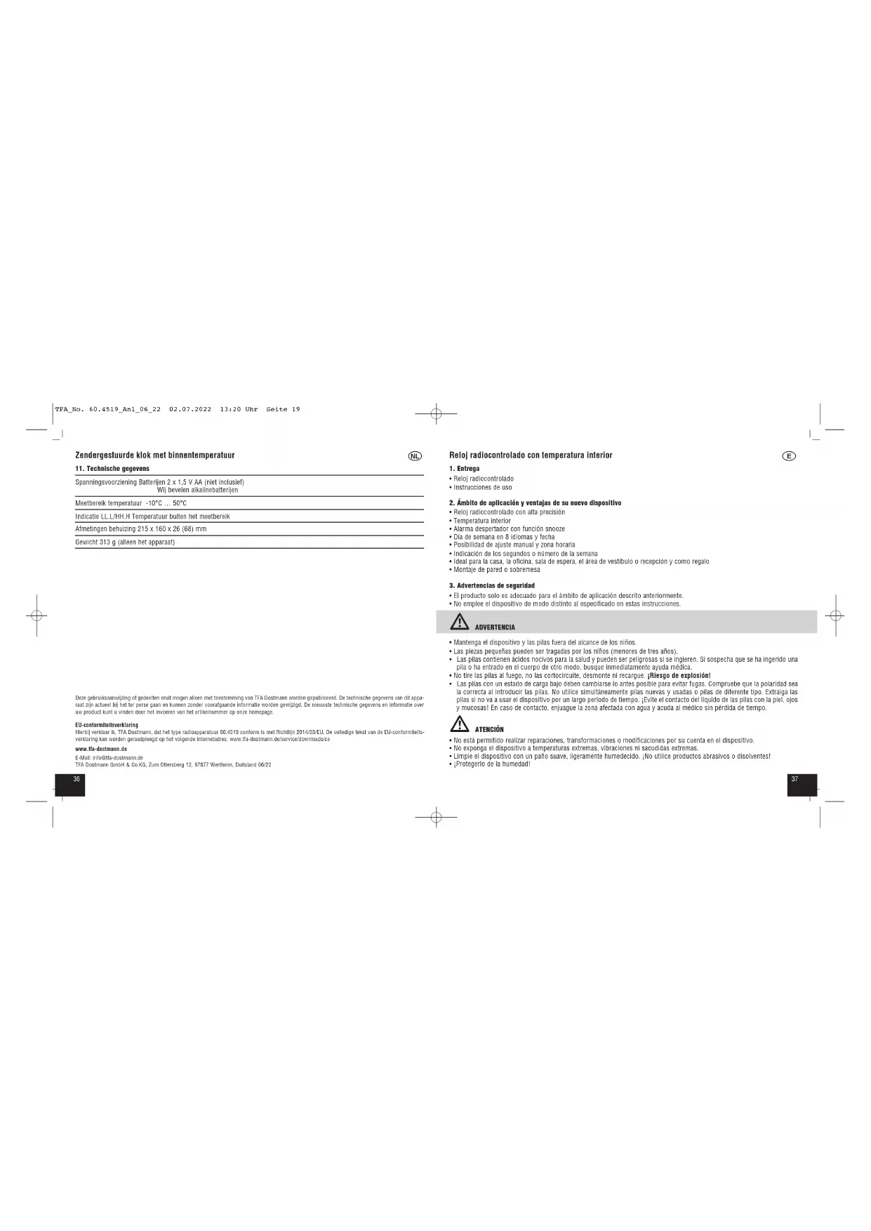 - ¡Protegerlo de la humedad! TFA_No. 60.4519_Anl_06_22 02.07.2022 13:20 Uhr Seite 193938 Reloj radiocontrolado con temperatura interior