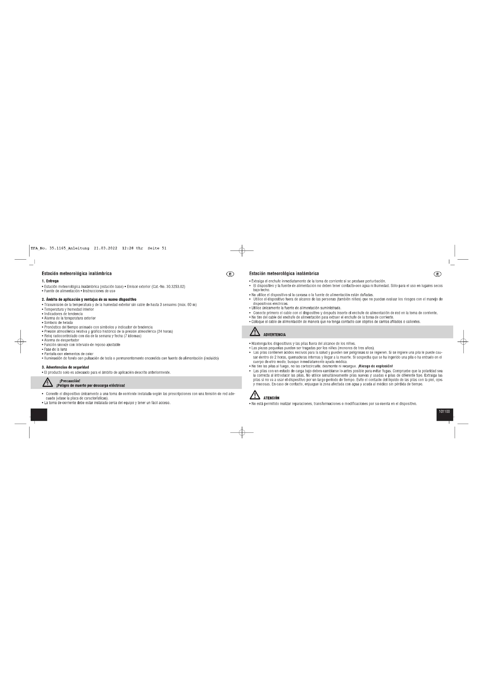 - No está permitido realizar reparaciones, transformaciones o modificaciones por su cuenta en el dispositivo. TFA_No. 35.1165_Anleitung 21.03.2022 12:28 Uhr Seite 51103102 Estación meteorológica inalámbrica