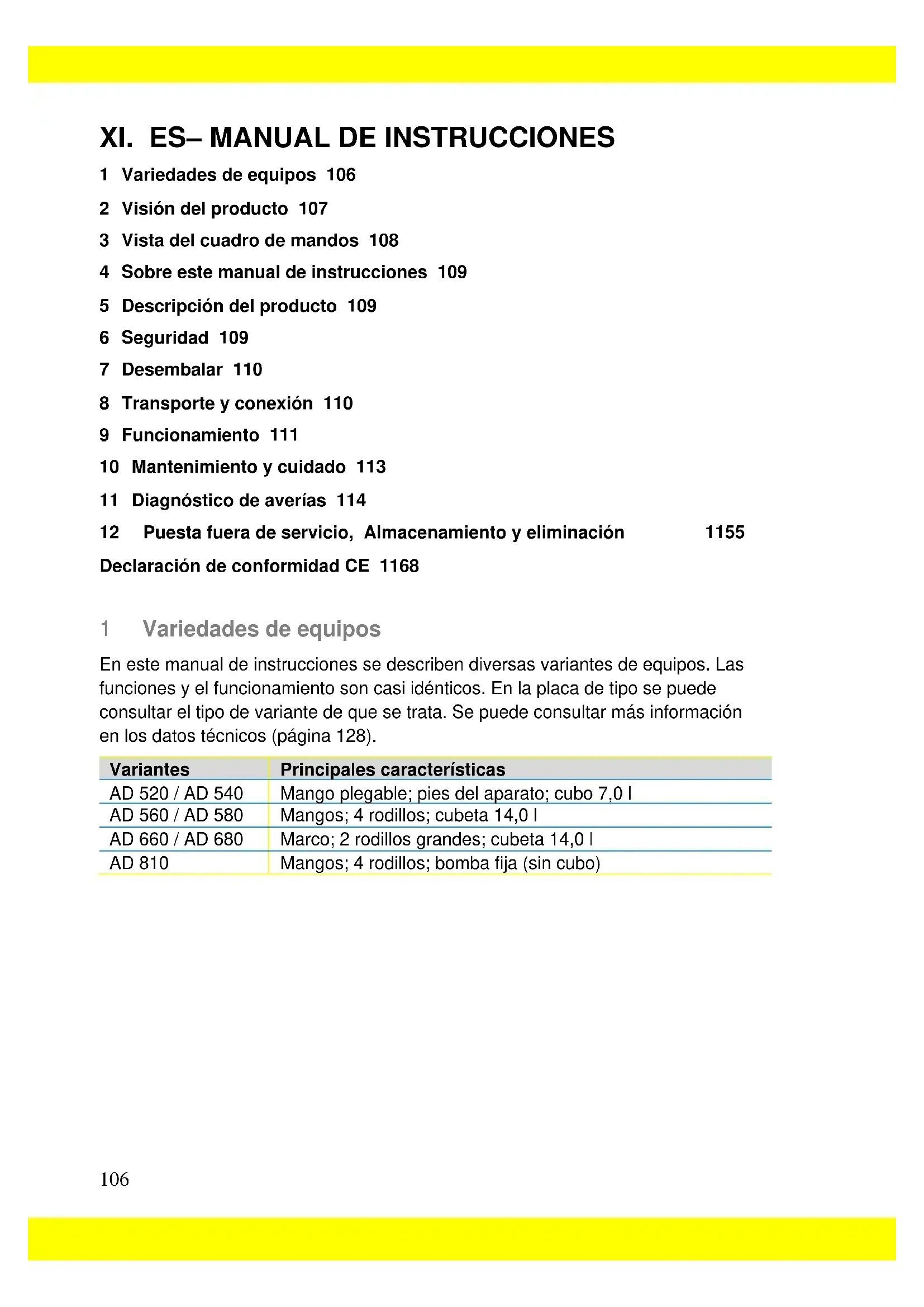 1 Variedades de equipos 106 2 Visión del producto 107 3 Vista del cuadro de mandos 108 4 Sobre este manual de instrucciones 109 5 Descripción del producto 109 6 Seguridad 109 7 Desembalar 110 8 Transporte y conexión 110 9 Funcionamiento 111 10 Mantenimiento y cuidado 113 11 Diagnóstico de averías 114 12 Puesta fuera de servicio, Almacenamiento y eliminación 1155 Declaración de conformidad CE 1168 1 Variedades de equipos En este manual de instrucciones se describen diversas variantes de equipos. Las funciones y el funcionamiento son casi idénticos. En la placa de tipo se puede consultar el tipo de variante de que se trata. Se puede consultar más información en los datos técnicos (página 128). Variantes Principales características AD 520 / AD 540 Mango plegable; pies del aparato; cubo 7,0 l AD 560 / AD 580 Mangos; 4 rodillos; cubeta 14,0 l AD 660 / AD 680 Marco; 2 rodillos grandes; cubeta 14,0 l AD 810 Mangos; 4 rodillos; bomba fija (sin cubo)107 2 Visión del producto