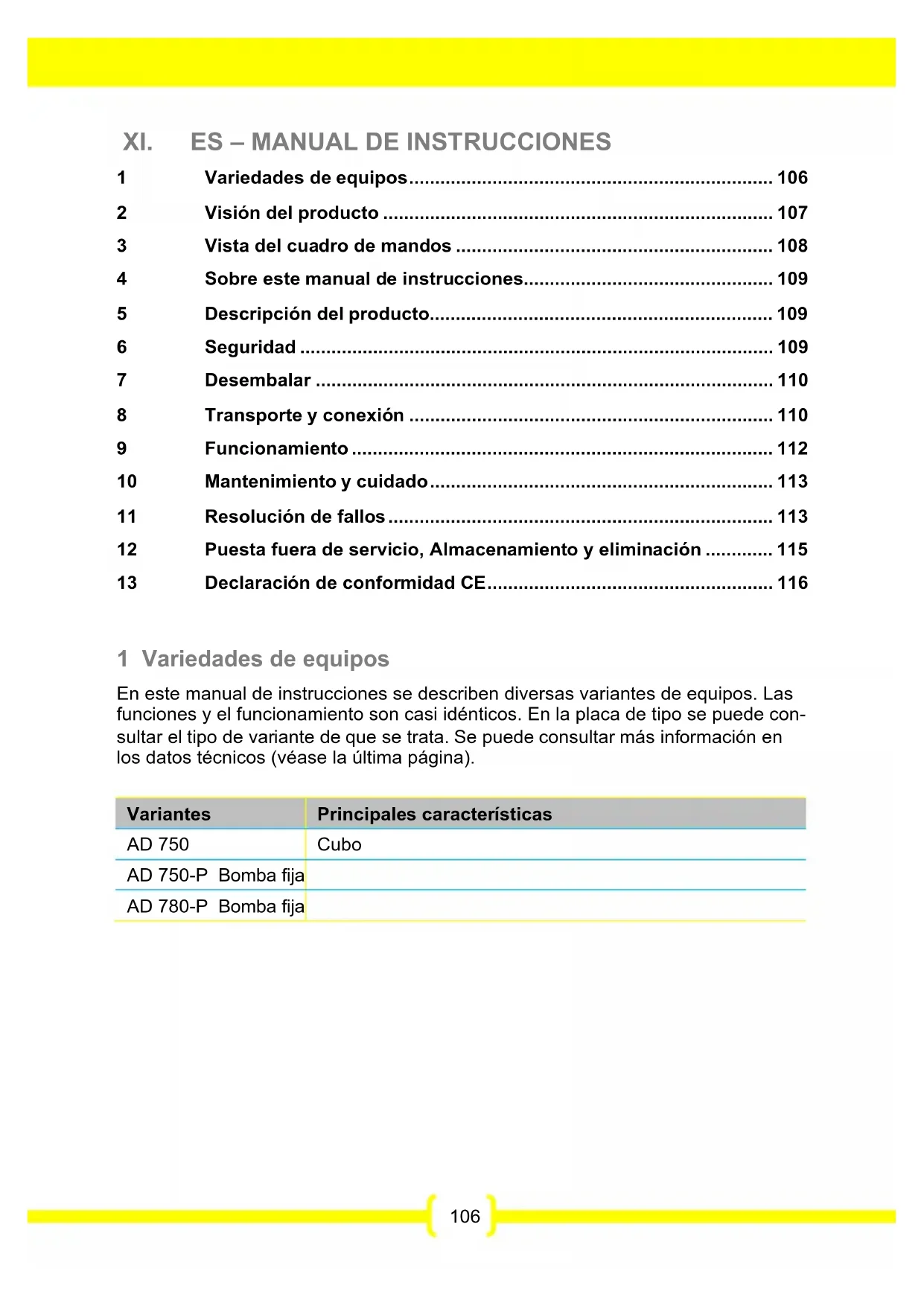 - 13 Declaración de conformidad CE 1 Variedades de equipos En este manual de instrucciones se describen diversas variantes de equipos. Las funciones y el funcionamiento son casi idénticos. En la placa de tipo se puede con- sultar el tipo de variante de que se trata. Se puede consultar más información en los datos técnicos (véase la última página). Variantes Principales características AD 750 Cubo AD 750-P Bomba fija AD 780-P Bomba fija107 2 Visión del producto Fig. 1: Vista delantera p. 116