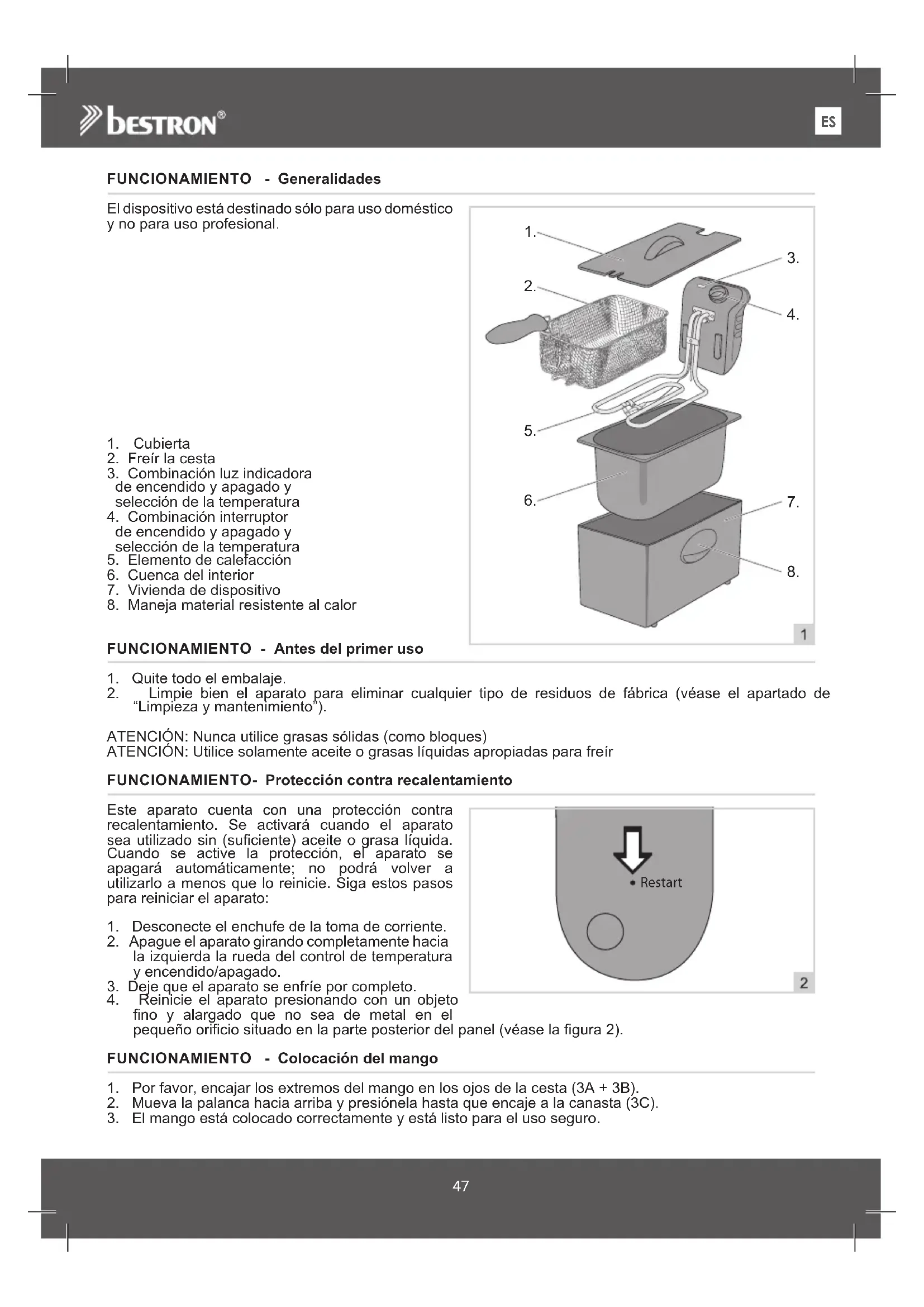 “Limpieza y mantenimiento”). ATENCIÓN: Nunca utilice grasas sólidas (como bloques) ATENCIÓN: Utilice solamente aceite o grasas líquidas apropiadas para freír FUNCIONAMIENTO - Protección contra recalentamiento Este aparato cuenta con una protección contra recalentamiento. Se activará cuando el aparato sea utilizado sin (suficiente) aceite o grasa líquida. Cuando se active la protección, el aparato se apagará automáticamente; no podrá volver a utilizarlo a menos que lo reinicie. Siga estos pasos para reiniciar el aparato: