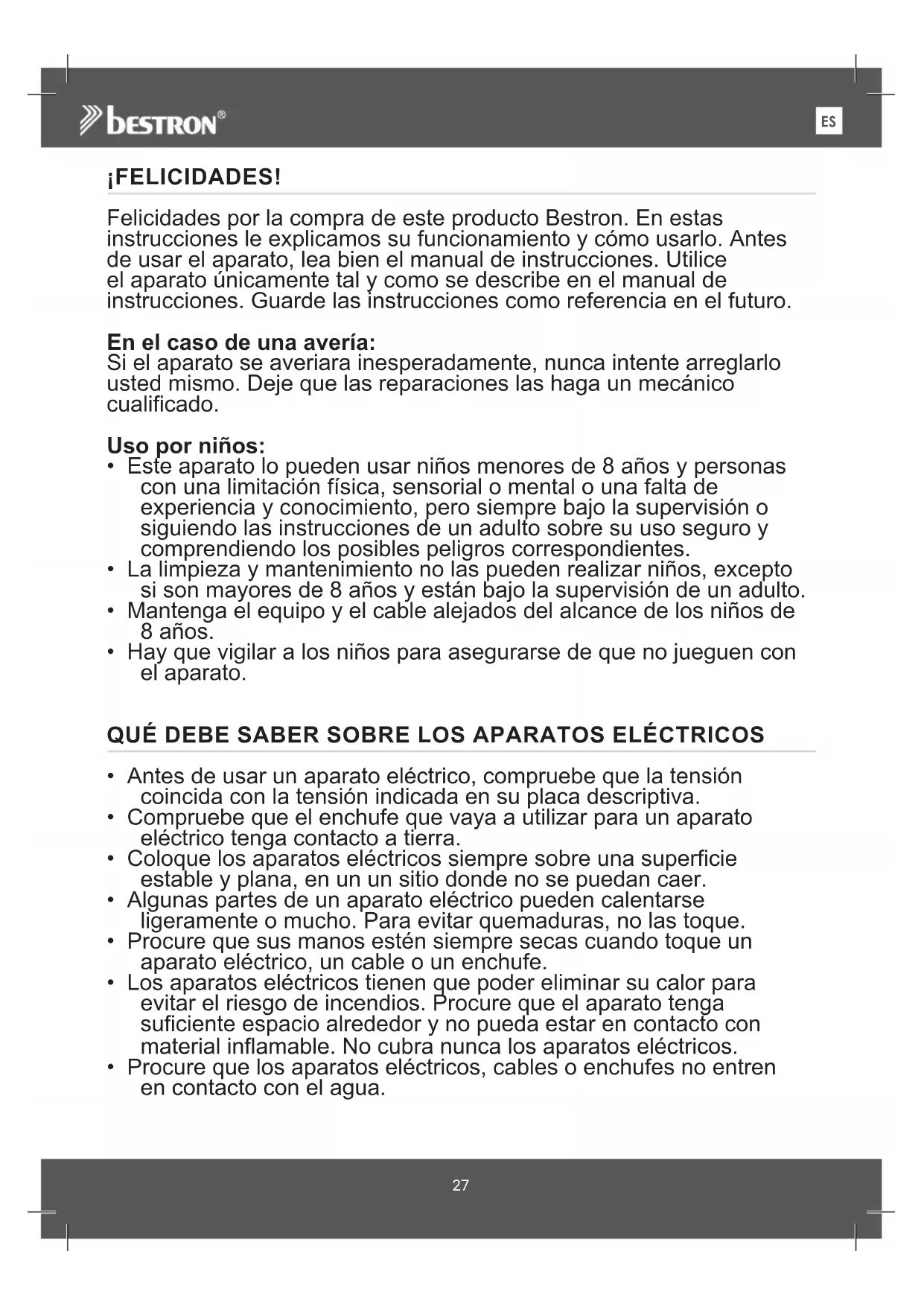 IT¡FELICIDADES! Felicidades por la compra de este producto Bestron. En estas instrucciones le explicamos su funcionamiento y cómo usarlo. Antes de usar el aparato, lea bien el manual de instrucciones. Utilice el aparato únicamente tal y como se describe en el manual de instrucciones. Guarde las instrucciones como referencia en el futuro. En el caso de una avería: Si el aparato se averiara inesperadamente, nunca intente arreglarlo usted mismo. Deje que las reparaciones las haga un mecánico cualificado. Uso por niños: