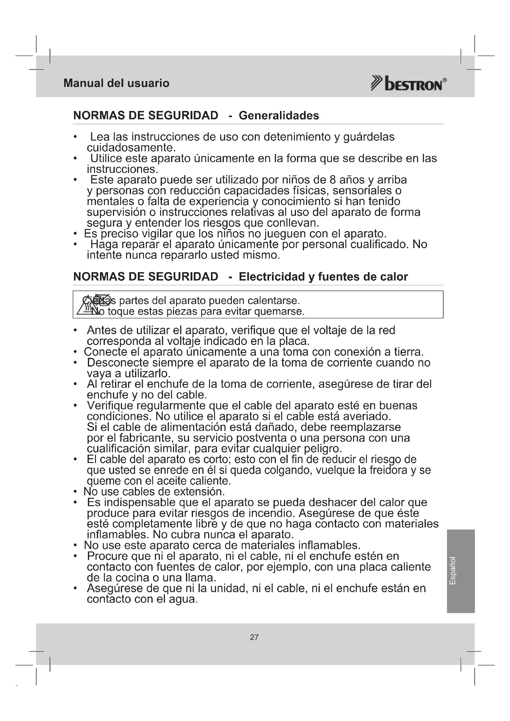 - Procure que ni el aparato, ni el cable, ni el enchufe estén en contacto con fuentes de calor, por ejemplo, con una placa caliente de la cocina o una llama.