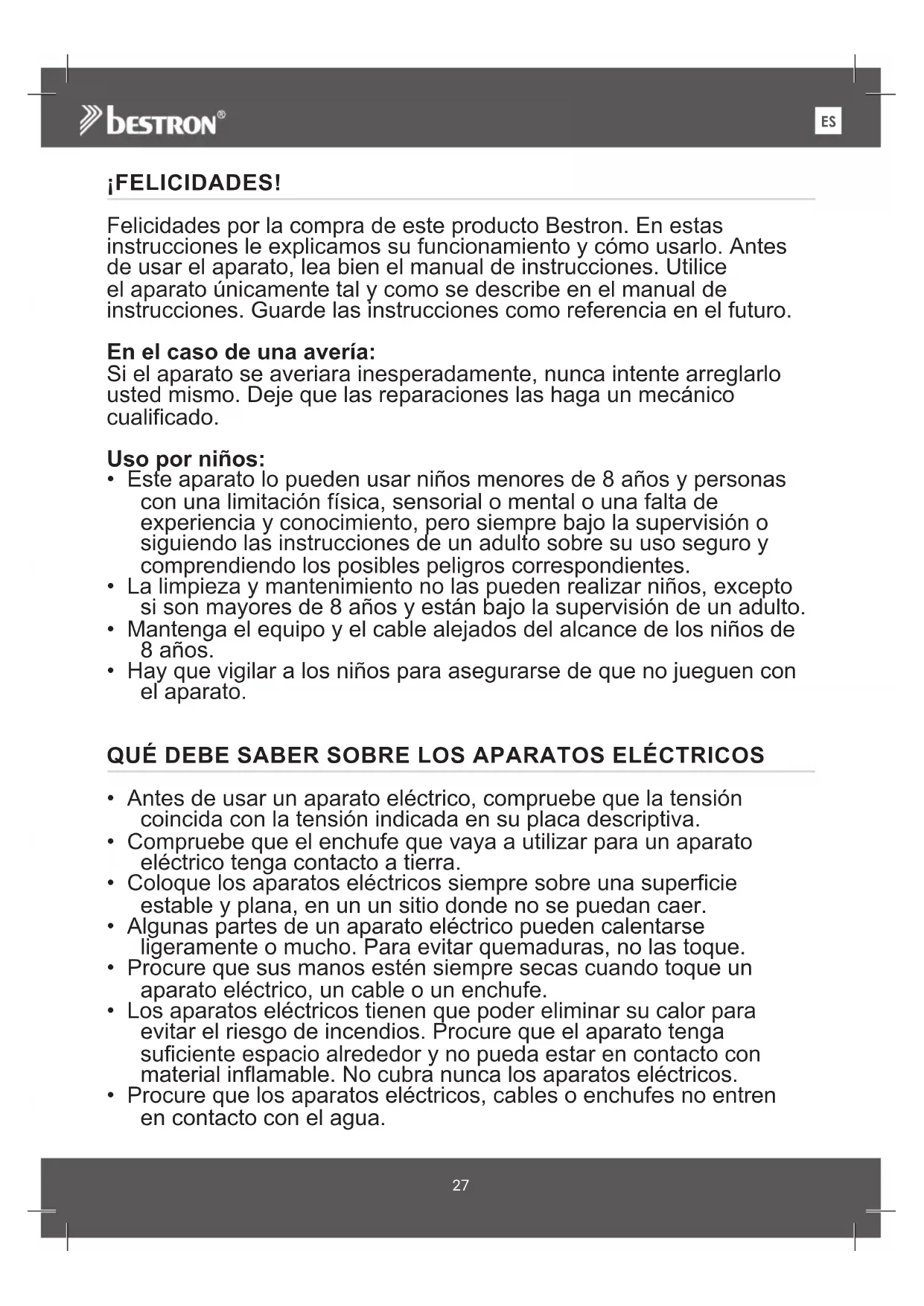 ¡FELICIDADES! Felicidades por la compra de este producto Bestron. En estas instrucciones le explicamos su funcionamiento y cómo usarlo. Antes de usar el aparato, lea bien el manual de instrucciones. Utilice el aparato únicamente tal y como se describe en el manual de instrucciones. Guarde las instrucciones como referencia en el futuro. En el caso de una avería: Si el aparato se averiara inesperadamente, nunca intente arreglarlo usted mismo. Deje que las reparaciones las haga un mecánico cualificado. Uso por niños: