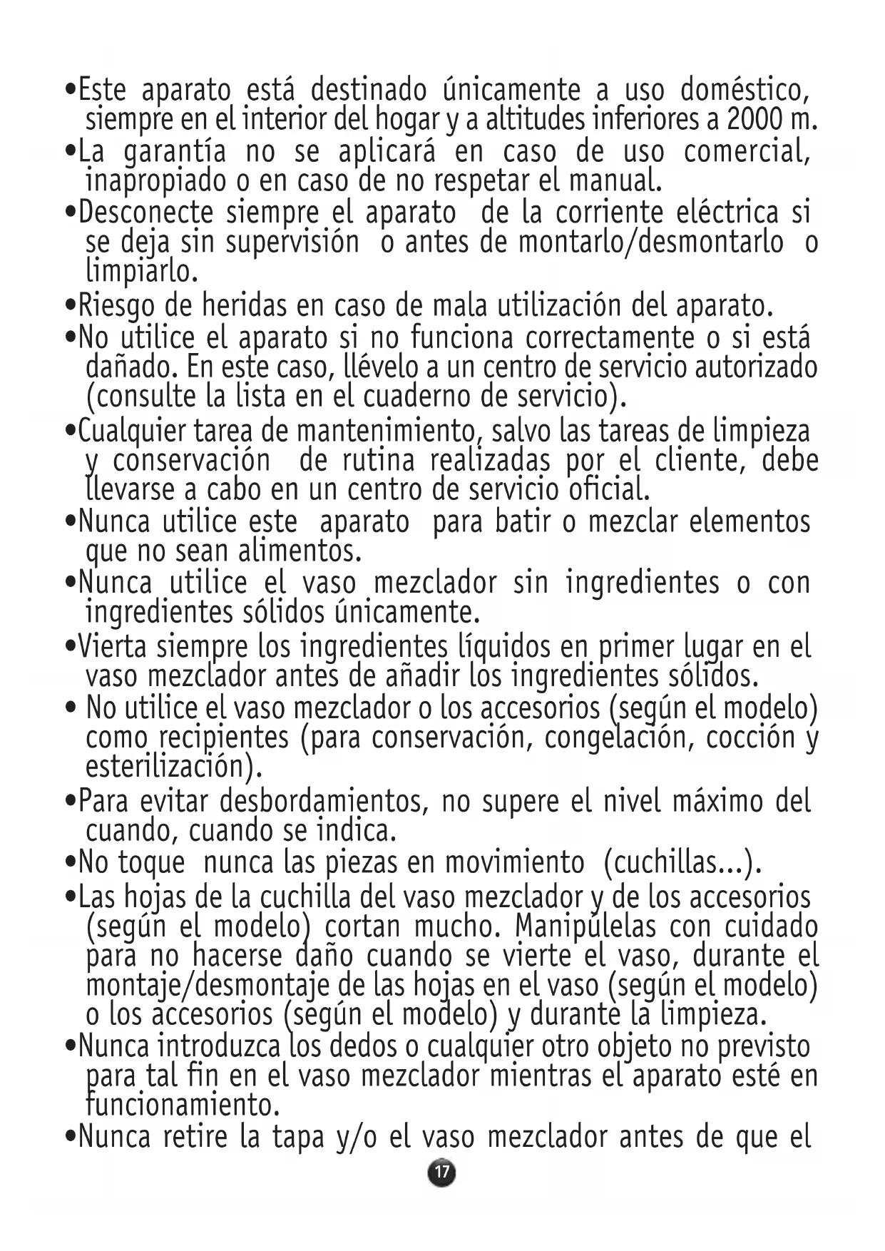 - Nunca introduzca los dedos o cualquier otro objeto no previsto para tal fin en el vaso mezclador mientras el aparato esté en funcionamiento.