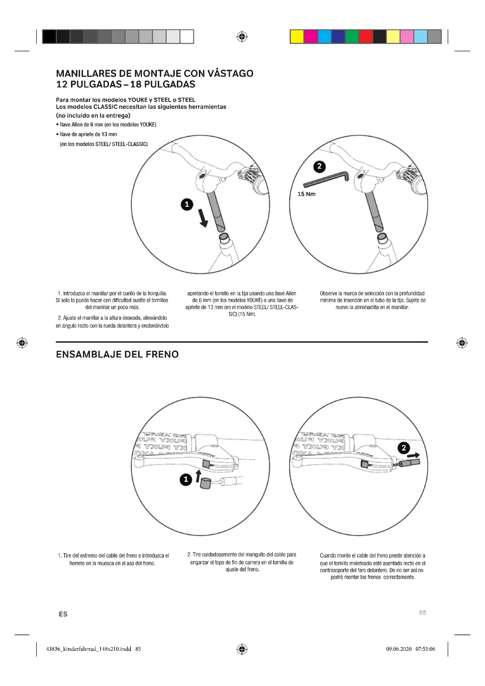 Establecer la capacidad de circulación teniendo en cuenta la altura del niño. El sillín debe ser ajustado de forma que como mínimo las puntas de los pies, preferiblemente la planta, lleguen al suelo, para permanecer en equilibrio cuando no se circula. Es preciso seguir estrictamente la marca de la profundidad mínima de inserción en el soporte del sillín en el tubo. Más información abajo. El manillar y la palanca del freno y el timbre tienen que estar bien accesibles para el niños. Teniendo en cuenta la marca de la profundidad mínima de inserción del vástago del manillar. Tras ajustar el manillar apretar los tornillos de sujeción. Controle la bici antes de usarla con la siguiente Lista de comprobación de seguridad. En el montaje de los pedales tener en cuenta la rosca hacia la izquierda o la derecha (marcado con R o L cerca de la rosca en el eje del pedal). Las imágenes con las instrucciones de montaje están en las últimas páginas de este manual. ¡Una vez realizado el montaje revise el vehículo conforme a la lista de comprobación de seguridad! Cuando realice el montaje tenga en cuenta que algunas piezas, tales como la rosca de los pedales y el cono de sujeción están engrasadas. El montaje debe ser realizado a conciencia por un adulto, para que evitar que ocurran accidentes o lesiones Tómese el tiempo necesario para ello. En algunos puntos es necesario apretar los tornillos con un par determinado. Ese par está indicado en newtómetros (por ejemplo 2 Nm). Si se aprieta un tornillo muy poco la unión estará probablemente floja y no sea segura. Si se aprieta demasiado el tornillo y otras piezas pueden verse dañados e incluso destruidos. Si no está seguro póngase en contacto con su distribuidor oficial o con un taller. Retire primero las tapas protectoras de plástico de las tuercas de sombrerete del eje delantero y trasero y en los frenos Cantilever. Retire también la lámina plástica de protección de las manivelas. Retire la almohadilla del manillar y afloje dando unos pocos giros con la llave Allen de 6 mm (modelos YOUKE) o la llave de 13 mm (modelo STEEL/ STEEL-CLASSIC) el tornillo situado debajo en la tija. Ahora puede retirar la cubierta de plástico que protege el cono de sujeción en el extremo inferior de la tija.