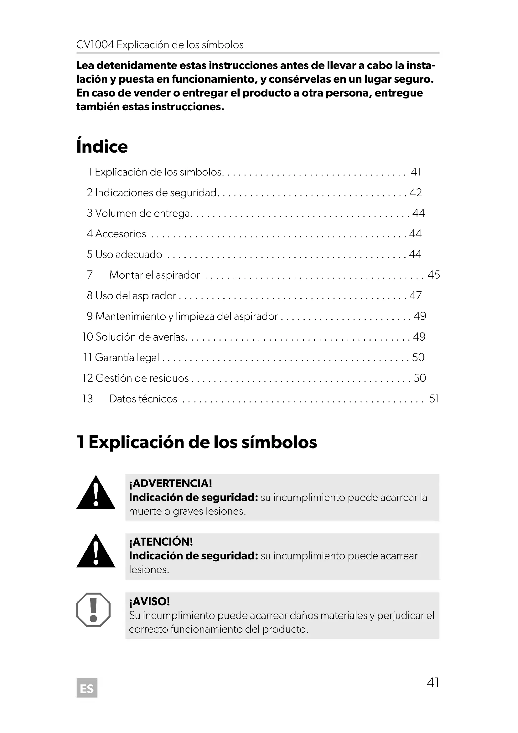 ¡ADVERTENCIA! Indicación de seguridad: su incumplimiento puede acarrear la muerte o graves lesiones. ¡ATENCIÓN! Indicación de seguridad: su incumplimiento puede acarrear lesiones. ¡AVISO! Su incumplimiento puede acarrear daños materiales y perjudicar el correcto funcionamiento del producto. CV1004-IO-16s.book Seite 41 Dienstag, 13. Februar 2018 5:32 17ES Indicaciones de seguridad CV1004