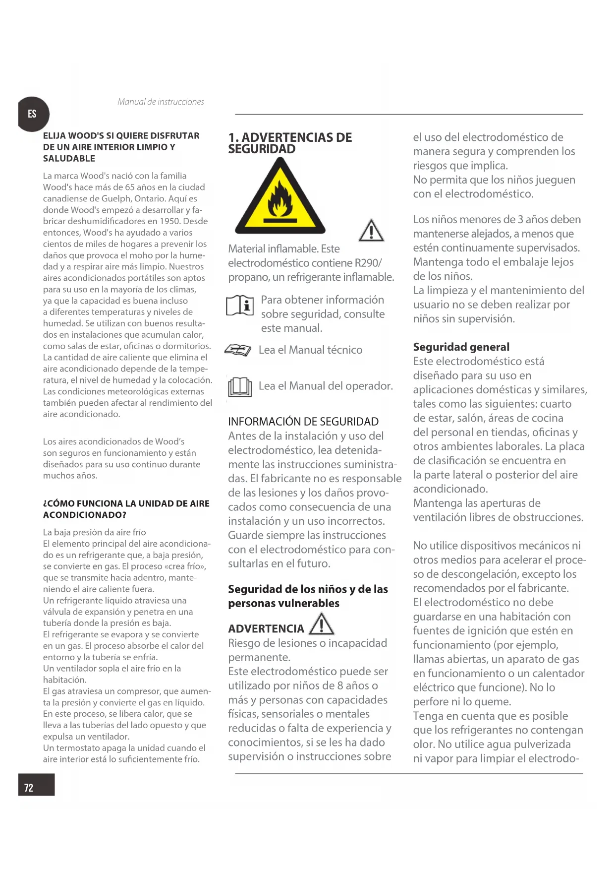 Antes de la instalación y uso del electrodoméstico, lea detenida- mente las instrucciones suministra- das. El fabricante no es responsable de las lesiones y los daños provo- cados como consecuencia de una instalación y un uso incorrectos. Guarde siempre las instrucciones con el electrodoméstico para con- sultarlas en el futuro. Seguridad de los niños y de las personas vulnerables ADVERTENCIA Riesgo de lesiones o incapacidad permanente. Este electrodoméstico puede ser utilizado por niños de 8 años o más y personas con capacidades físicas, sensoriales o mentales reducidas o falta de experiencia y conocimientos, si se les ha dado supervisión o instrucciones sobre el uso del electrodoméstico de manera segura y comprenden los riesgos que implica. No permita que los niños jueguen con el electrodoméstico. Los niños menores de 3 años deben mantenerse alejados, a menos que estén continuamente supervisados. Mantenga todo el embalaje lejos de los niños. La limpieza y el mantenimiento del usuario no se deben realizar por niños sin supervisión. Seguridad general Este electrodoméstico está diseñado para su uso en aplicaciones domésticas y similares, tales como las siguientes: cuarto de estar, salón, áreas de cocina del personal en tiendas, ocinas y otros ambientes laborales. La placa de clasicación se encuentra en la parte lateral o posterior del aire acondicionado. Mantenga las aperturas de ventilación libres de obstrucciones. No utilice dispositivos mecánicos ni otros medios para acelerar el proce- so de descongelación, excepto los recomendados por el fabricante. El electrodoméstico no debe guardarse en una habitación con fuentes de ignición que estén en funcionamiento (por ejemplo, llamas abiertas, un aparato de gas en funcionamiento o un calentador eléctrico que funcione). No lo perfore ni lo queme. Tenga en cuenta que es posible que los refrigerantes no contengan olor. No utilice agua pulverizada ni vapor para limpiar el electrodo-ES