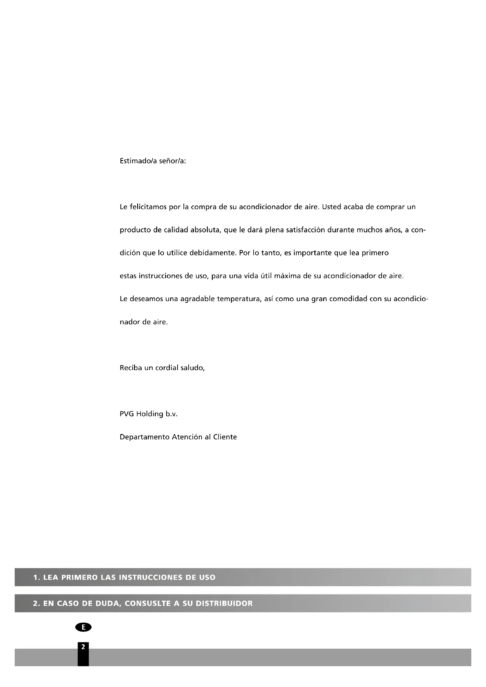 Estimado/a señor/a: Le felicitamos por la compra de su acondicionador de aire. Usted acaba de comprar un producto de calidad absoluta, que le dará plena satisfacción durante muchos años, a con- dición que lo utilice debidamente. Por lo tanto, es importante que lea primero estas instrucciones de uso, para una vida útil máxima de su acondicionador de aire. Le deseamos una agradable temperatura, así como una gran comodidad con su acondicio- nador de aire. Reciba un cordial saludo, PVG Holding b.v. Departamento Atención al Cliente5