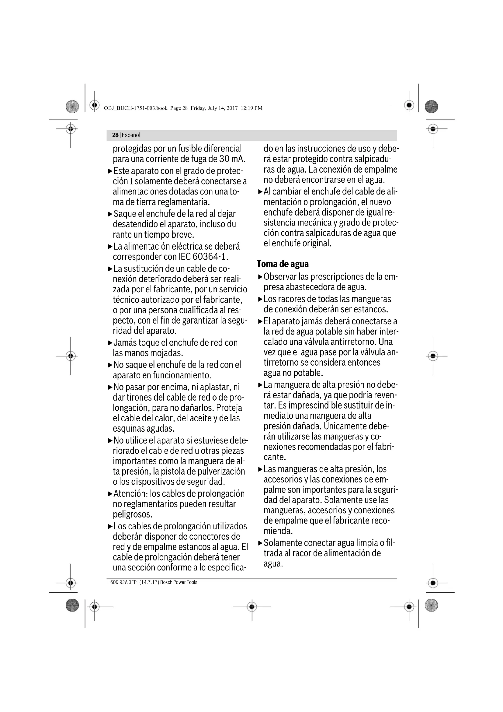 Limpiadora de alta presión GHP 5-13 C Estos datos son válidos para una tensión nominal de [U] 230 V. Los va-lores pueden variar para otras tensiones y en ejecuciones específicas para ciertos países.Los procesos de conexión provocan una breve caída de la tensión. Si las condiciones de la red fuesen desfavorables, ello puede llegar a afectar a otros aparatos. En redes con impedancias inferiores a 0,358 ohmios es improbable que lleguen a perturbarse otros aparatos. OBJ_BUCH-1751-003.book Page 31 Friday, July 14, 2017 12:19 PM Ω 0,35832 | Español 1 609 92A 3EP | (14.7.17) Bosch Power Tools Puesta en marcha Para su seguridad ¡Atención! Antes de realizar trabajos de man- tenimiento o limpieza desconecte el aparato para jardín y saque el enchufe de la red. Lo mis- mo deberá realizarse en caso de que se dañe, corte, o enrede el cable de alimentación. Para su seguridad, el aparato para jardín dispone de un aisla- miento de protección y no precisa por lo tanto ser conectado a tierra. La tensión de servicio es de 230 V AC, 50 Hz (para países no pertenecientes a la CE también 220 V ó 240 V). Para una mayor seguridad emplee un fusible diferencial (RCD) para una corriente de fuga máxima de 30 mA. Compro- bar el funcionamiento correcto del fusible diferencial antes de cada uso. Los cables de red y de prolongación deberán inspeccionarse con regularidad en cuanto a posibles daños y solamente se utilizarán si se encuentran en perfectas condiciones. La sustitución de un cable de conexión deteriorado deberá ser realizada por Bosch o por un servicio técnico autorizado para herramientas eléctricas Bosch con el fin de garantizar la seguridad del aparato. Únicamente use cables de prolongación homologados. PRECAUCIÓN: Los cables de prolongación no reglamentarios pueden resultar peligrosos. Los cables de prolongación, enchufes y empal- mes deberán ser estancos al agua y aptos para su uso a la intemperie. Solo use cables de prolongación, conductores, o tambores para cables que se correspondan con las normas EN 61242 / IEC 61242 o IEC 60884-2-7. Si precisa un cable de prolongación para trabajar con el apa- rato, la sección del cable deberá ser la siguiente: – Sección del cable 1,5 mm