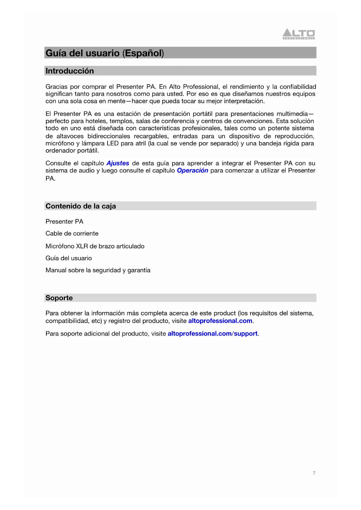 Soporte Para obtener la información más completa acerca de este product (los requisitos del sistema, compatibilidad, etc) y registro del producto, visite altoprofessional.com. Para soporte adicional del producto, visite altoprofessional.com/support.8