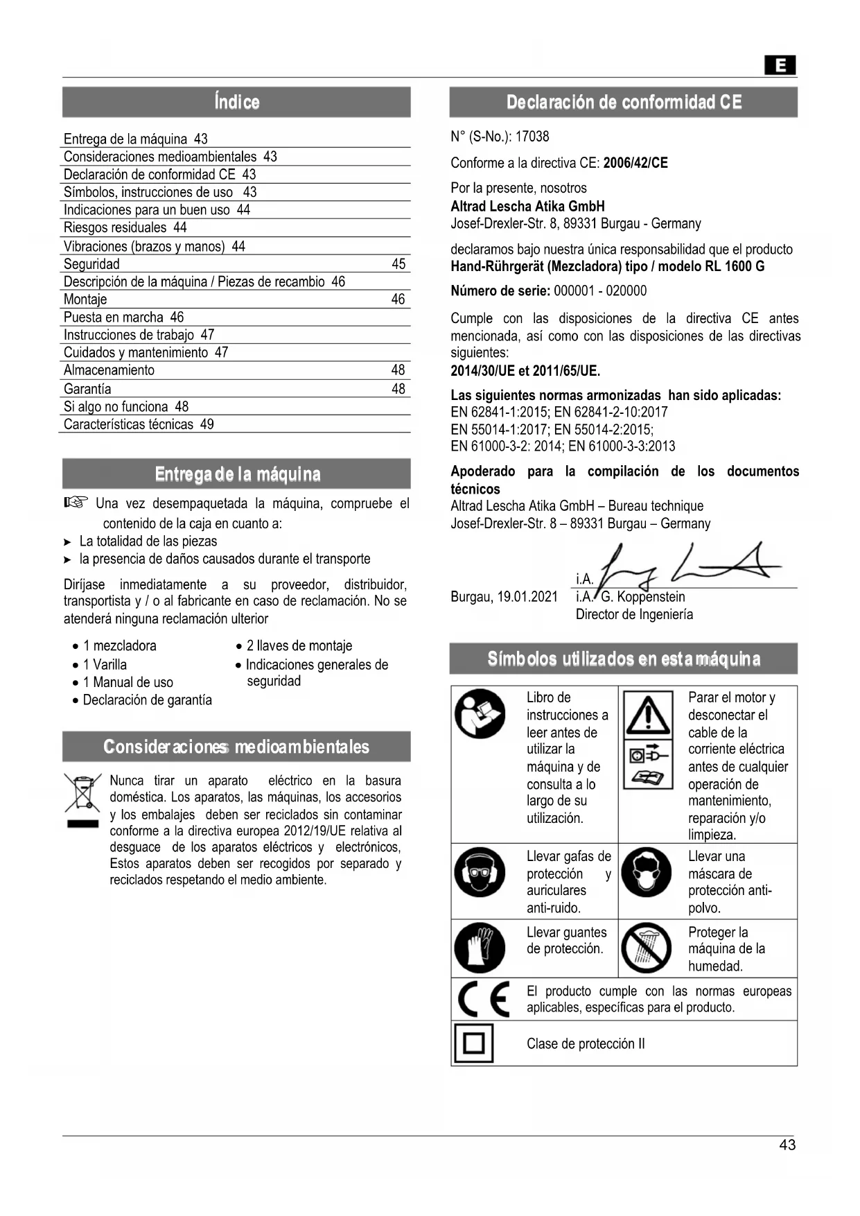 N° (S-No.): 17038 Conforme a la directiva CE: 2006/42/CE Por la presente, nosotros Altrad Lescha Atika GmbH Josef-Drexler-Str. 8, 89331 Burgau - Germany declaramos bajo nuestra única responsabilidad que el producto Hand-Rührgerät (Mezcladora) tipo / modelo RL 1600 G Número de serie: 000001 - 020000