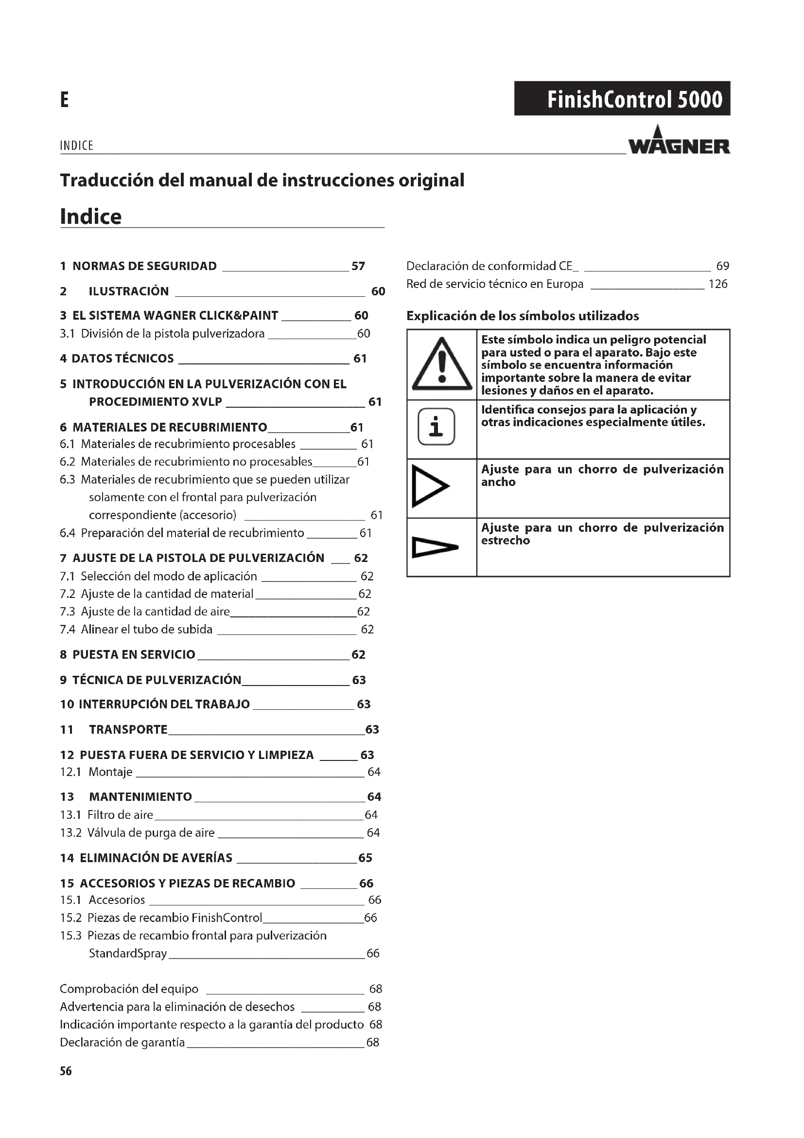 Traducción del manual de instrucciones original INDICE Indice 1 NORMAS DE SEGURIDAD ____________________ 572 ILUSTRACIÓN ______________________________ 603 EL SISTEMA WAGNER CLICK&PAINT ___________ 603.1 División de la pistola pulverizadora ______________ 604 DATOS TÉCNICOS ___________________________ 615 INTRODUCCIÓN EN LA PULVERIZACIÓN CON EL PROCEDIMIENTO XVLP ______________________ 616 MATERIALES DE RECUBRIMIENTO _____________ 616.1 Materiales de recubrimiento procesables _________ 616.2 Materiales de recubrimiento no procesables _______ 616.3 Materiales de recubrimiento que se pueden utilizar solamente con el frontal para pulverización correspondiente (accesorio) ___________________ 616.4 Preparación del material de recubrimiento ________ 617 AJUSTE DE LA PISTOLA DE PULVERIZACIÓN ___ 627.1 Selección del modo de aplicación _______________ 627.2 Ajuste de la cantidad de material ________________ 627.3 Ajuste de la cantidad de aire ____________________ 627.4 Alinear el tubo de subida ______________________ 628 PUESTA EN SERVICIO ________________________ 629 TÉCNICA DE PULVERIZACIÓN_________________ 6310 INTERRUPCIÓN DEL TRABAJO ________________ 6311 TRANSPORTE _______________________________ 6312 PUESTA FUERA DE SERVICIO Y LIMPIEZA ______ 6312.1 Montaje ____________________________________ 6413 MANTENIMIENTO ___________________________ 6413.1 Filtro de aire _________________________________ 6413.2 Válvula de purga de aire _______________________ 6414 ELIMINACIÓN DE AVERÍAS ___________________ 6515 ACCESORIOS Y PIEZAS DE RECAMBIO _________ 6615.1 Accesorios __________________________________ 6615.2 Piezas de recambio FinishControl ________________ 6615.3 Piezas de recambio frontal para pulverización StandardSpray _______________________________ 66Comprobación del equipo _________________________ 68Advertencia para la eliminación de desechos __________ 68Indicación importante respecto a la garantía del producto 68Declaración de garantía ____________________________ 68Declaración de conformidad CE_ ____________________ 69Red de servicio técnico en Europa __________________ 126 Explicación de los símbolos utilizados Este símbolo indica un peligro potencial para usted o para el aparato. Bajo este símbolo se encuentra información importante sobre la manera de evitar lesiones y daños en el aparato.
