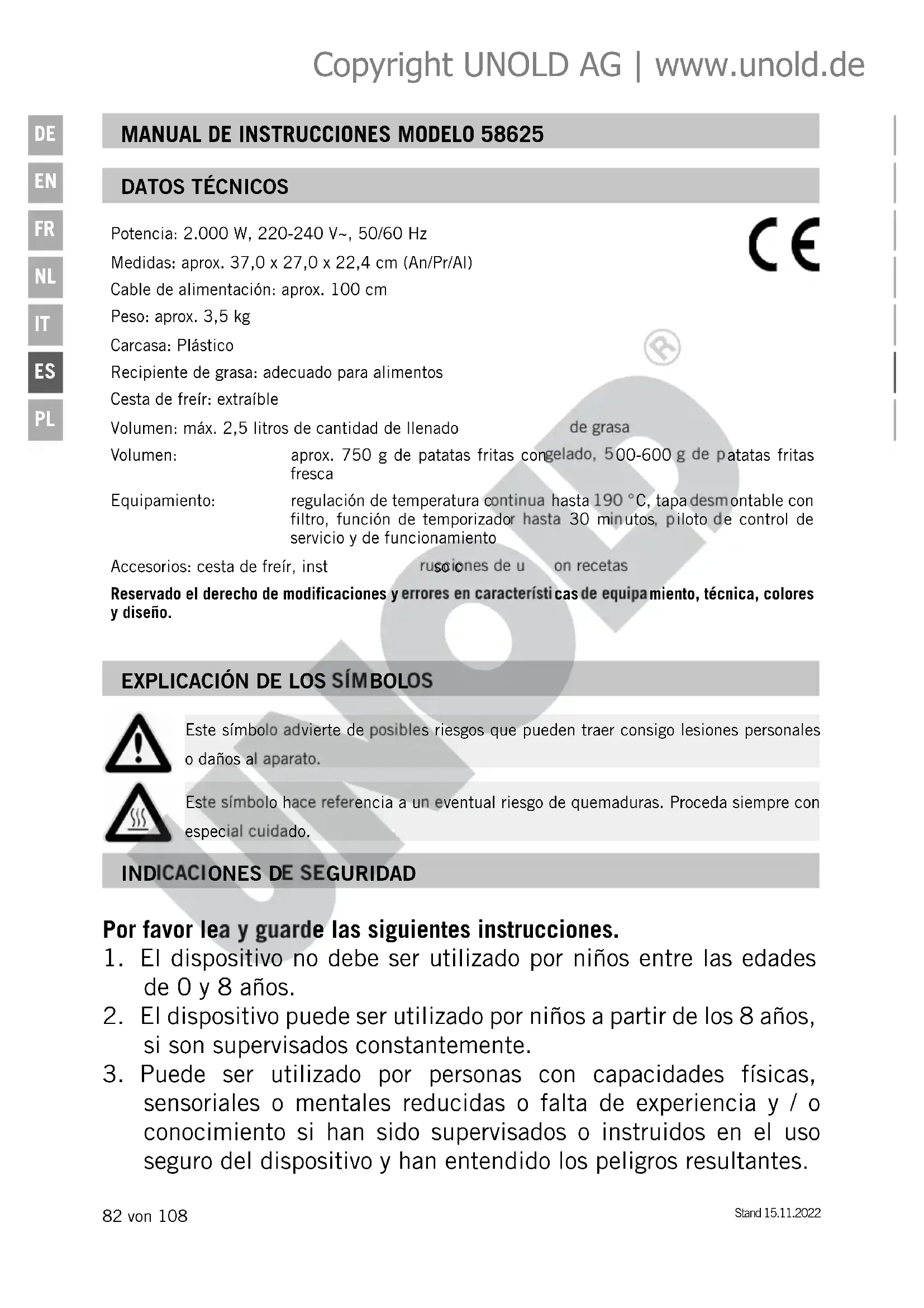 Este símbolo advierte de posibles riesgos que pueden traer consigo lesiones personales o daños al aparato. Este símbolo hace referencia a un eventual riesgo de quemaduras. Proceda siempre con especial cuidado. Copyright UNOLD AG | www.unold.deStand 15.11.2022 83 von 108