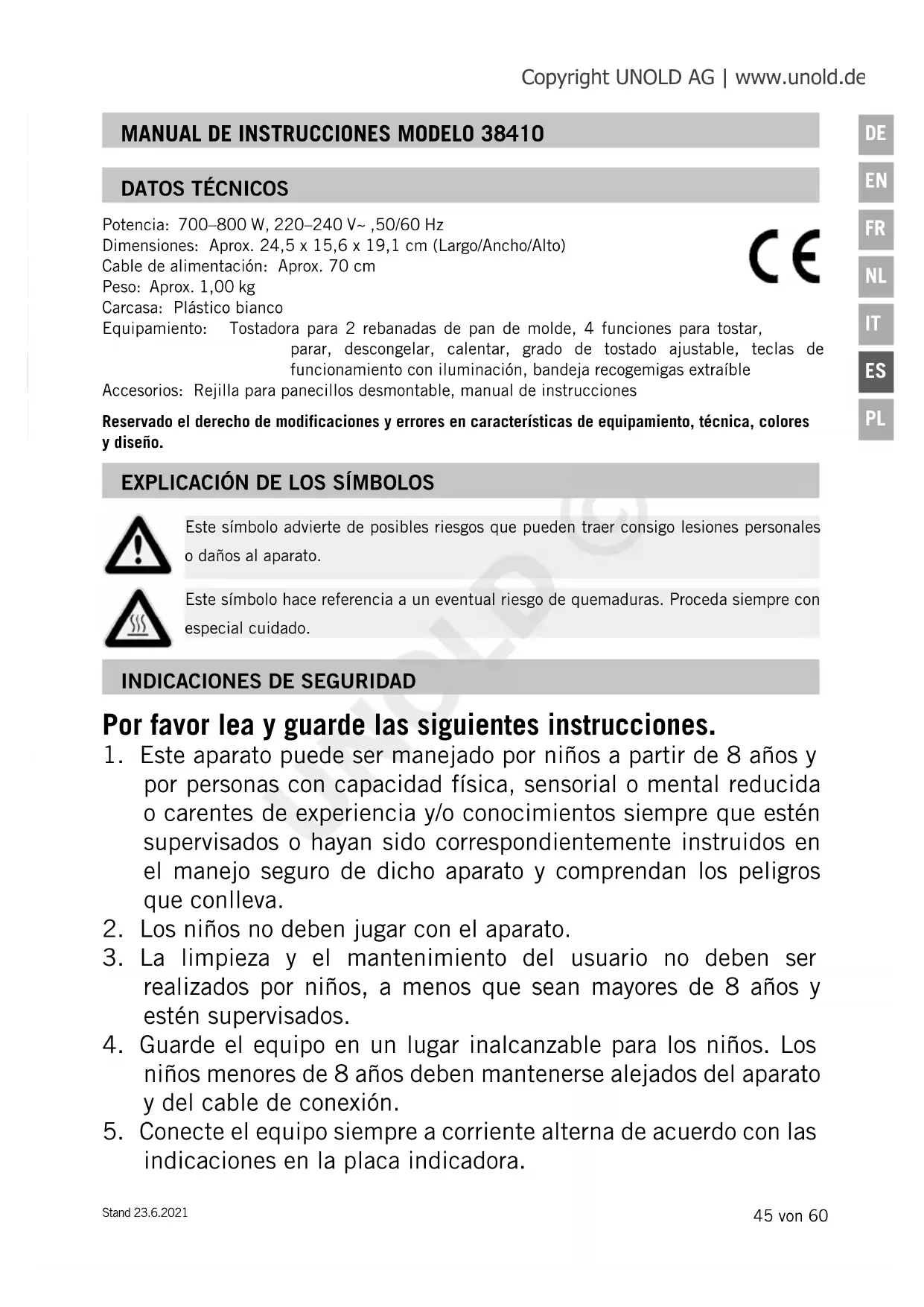 Este símbolo advierte de posibles riesgos que pueden traer consigo lesiones personales o daños al aparato.Este símbolo hace referencia a un eventual riesgo de quemaduras. Proceda siempre con especial cuidado. Copyright UNOLD AG | www.unold.de UNOLD ©46 von 60 Stand 23.6.2021