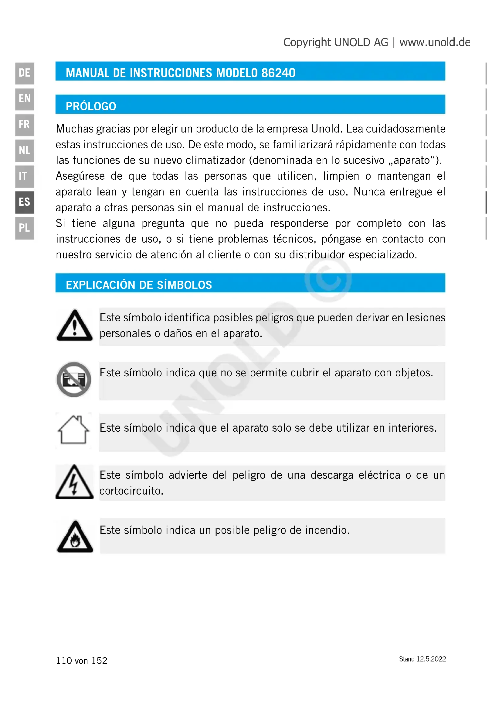 Este símbolo identifica posibles peligros que pueden derivar en lesiones personales o daños en el aparato. Este símbolo advierte del peligro de una descarga eléctrica o de un cortocircuito. Este símbolo indica que no se permite cubrir el aparato con objetos. Este símbolo indica que el aparato solo se debe utilizar en interiores. Este símbolo indica un posible peligro de incendio. Copyright UNOLD AG | www.unold.de UNOLD ©Stand 12.5.2022 111 von 152
