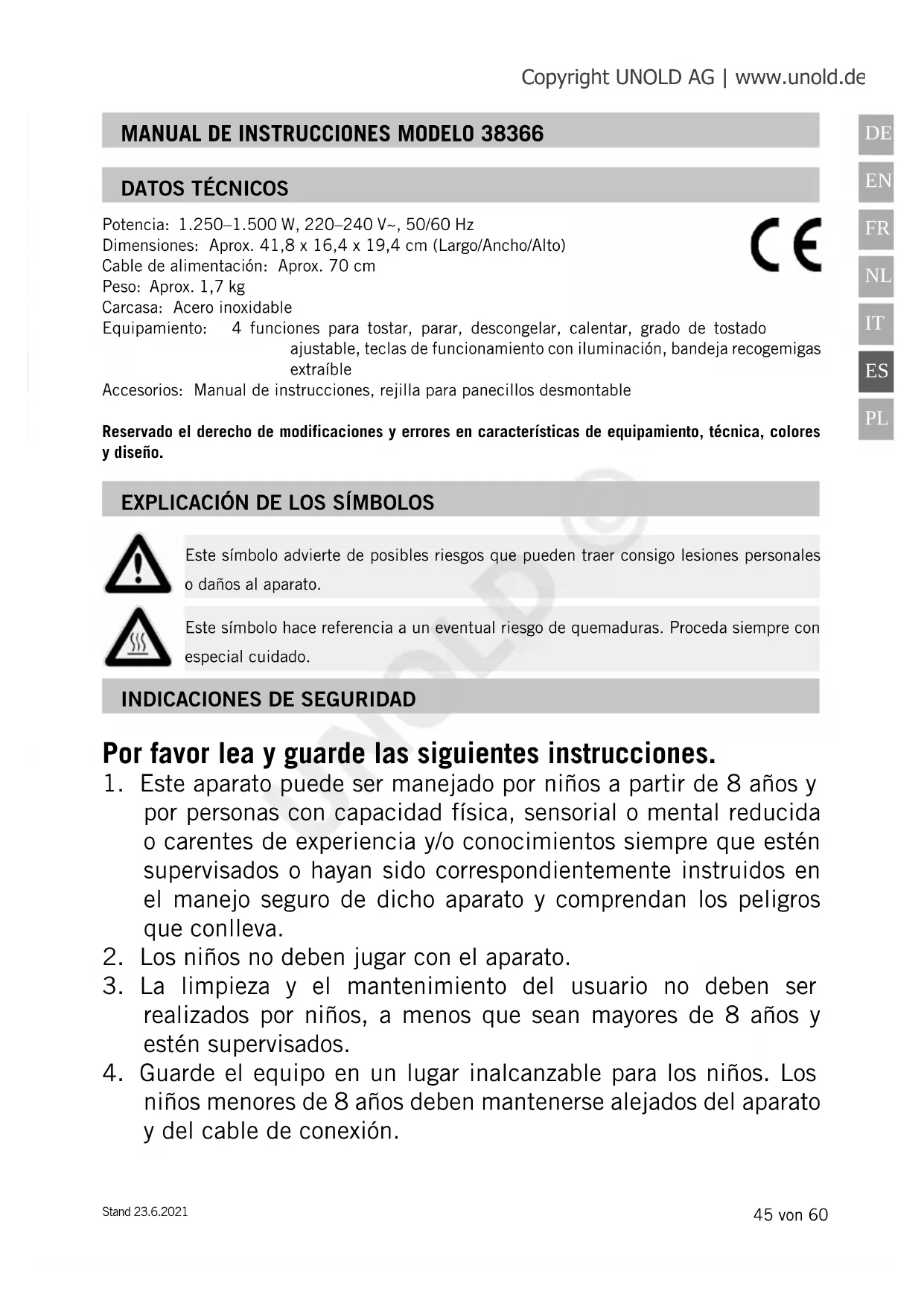 suministrado por el fabricante o su servicio o una persona cualificada del mismo modo que se va a sustituir, a fin de evitar peligros. El fabricante no asume ninguna responsabilidad en caso de montaje defectuoso, uso inapropiado o inco- rrecto o después de reparaciones realizadas por terceros no autorizados. PRECAUCIÓN: el aparato se calienta mucho durante el funcionamiento. De ninguna manera abra la carcasa del aparato. No introduzca herramientas, cubiertos o partes del cuerpo en las ranuras para el pan. Existe peligro de una descarga eléctrica. Copyright UNOLD AG | www.unold.de UNOLD ©48 von 60 Stand 23.6.2021