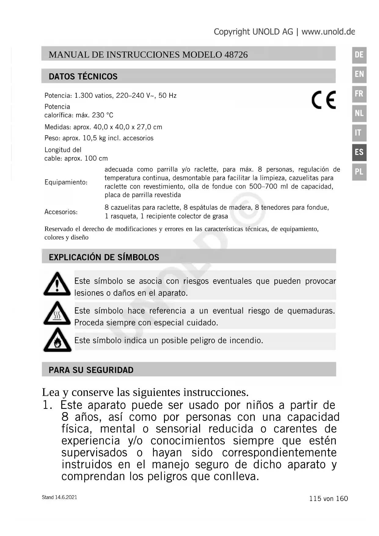 8 años, así como por personas con una capacidad física, mental o sensorial reducida o carentes de experiencia y/o conocimientos siempre que estén supervisados o hayan sido correspondientemente instruidos en el manejo seguro de dicho aparato y comprendan los peligros que conlleva. Este símbolo indica un posible peligro de incendio. Copyright UNOLD AG | www.unold.de UNOLD ©116 von 160 Stand 14.6.2021