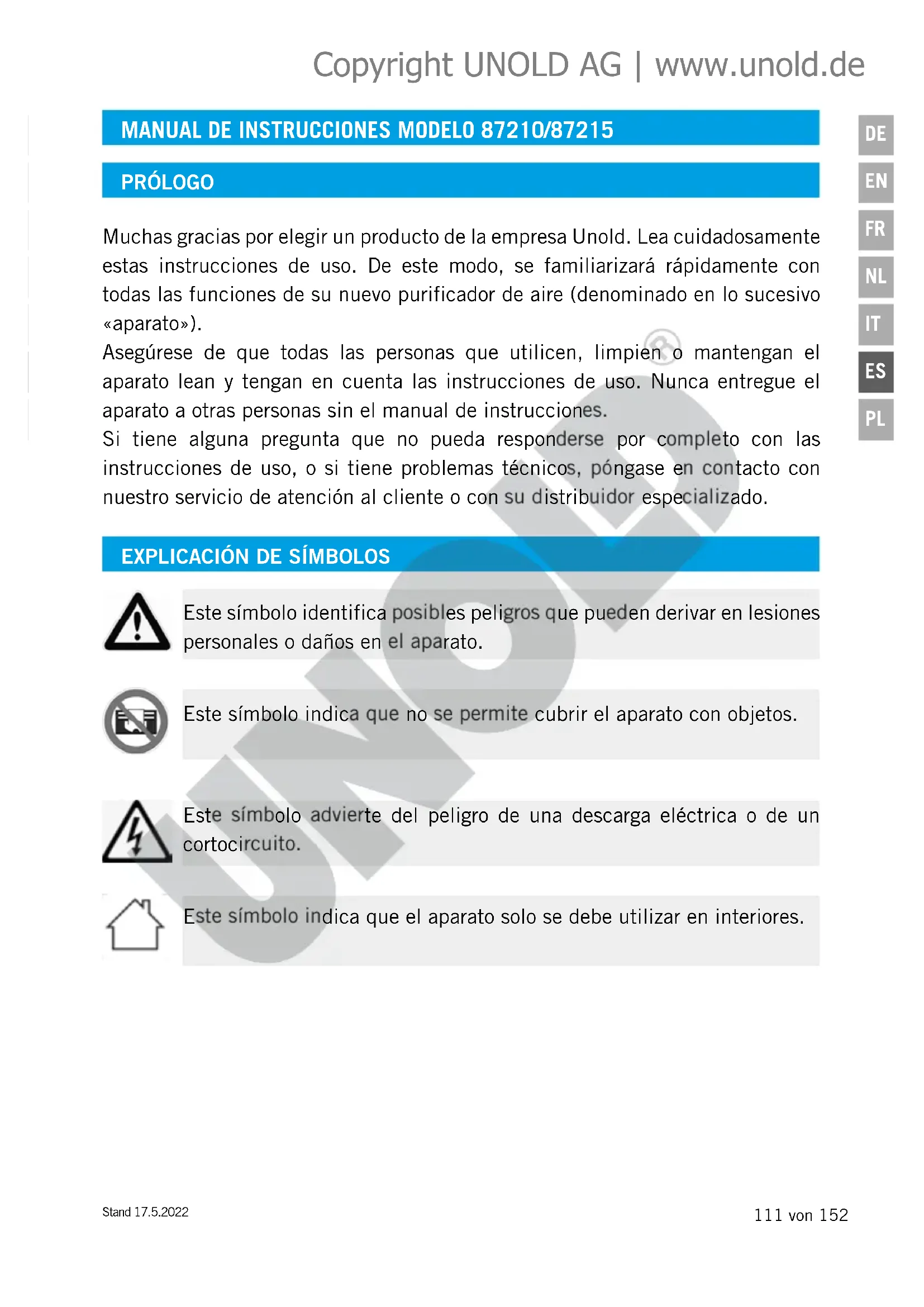 Este símbolo identifica posibles peligros que pueden derivar en lesiones personales o daños en el aparato. Este símbolo advierte del peligro de una descarga eléctrica o de un cortocircuito. Este símbolo indica que no se permite cubrir el aparato con objetos. Este símbolo indica que el aparato solo se debe utilizar en interiores. Copyright UNOLD AG | www.unold.de112 von 152 Stand 17.5.2022
