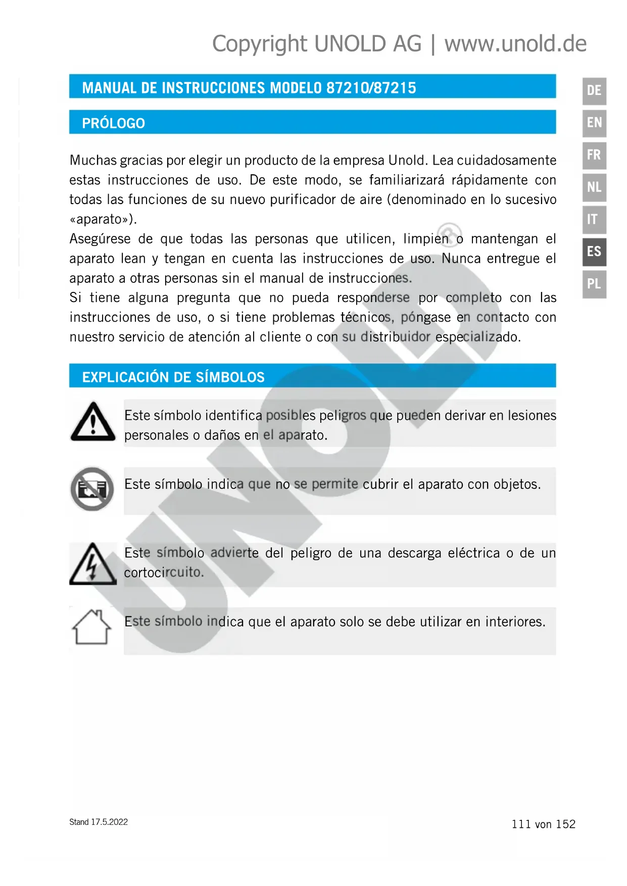 PRÓLOGO Muchas gracias por elegir un producto de la empresa Unold. Lea cuidadosamente estas instrucciones de uso. De este modo, se familiarizará rápidamente con todas las funciones de su nuevo purificador de aire (denominado en lo sucesivo «aparato»). Asegúrese de que todas las personas que utilicen, limpien o mantengan el aparato lean y tengan en cuenta las instrucciones de uso. Nunca entregue el aparato a otras personas sin el manual de instrucciones. Si tiene alguna pregunta que no pueda responderse por completo con las instrucciones de uso, o si tiene problemas técnicos, póngase en contacto con nuestro servicio de atención al cliente o con su distribuidor especializado.